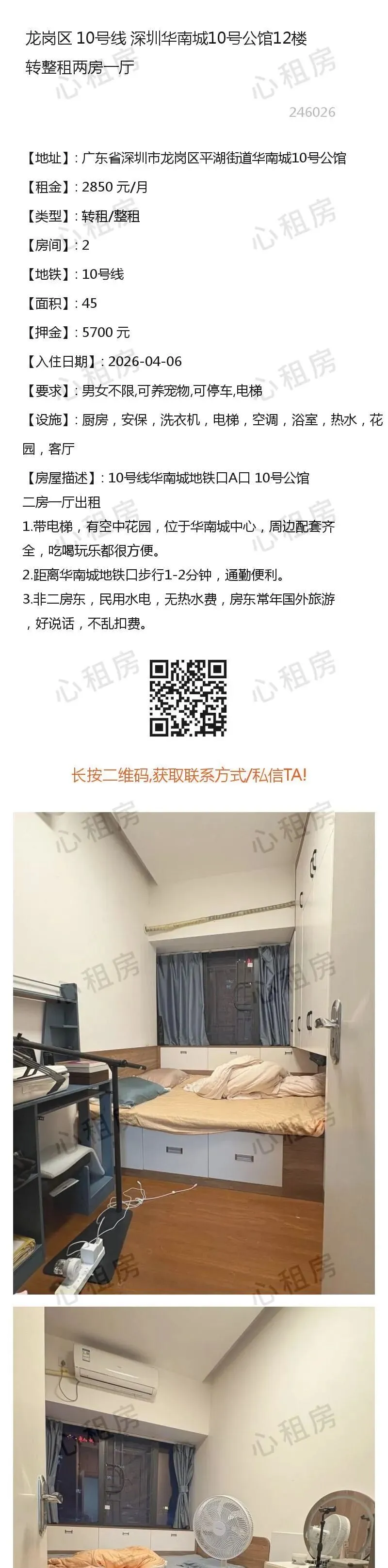 深圳租房【龙岗2则】房源①:10号线深圳龙岗华南城10号公馆12楼转整租两房一厅2850元/月;房源②:.........