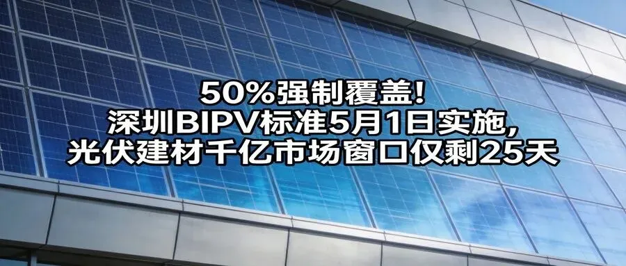 核心提示:深圳《建筑光伏一体化技术标准》(SJG220-2026)将于5月1日正式实施,成为全国首个BIPV地方强制标准。新建建筑光伏覆盖率不低于50%的强制要求,为光伏建材供应商打开了千亿级市场窗口。距离标准实施仅剩25天,技术升级窗口期紧迫。