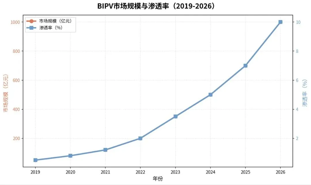 图表1:BIPV市场规模与渗透率(2019-2026) 成本下降显著:晶硅BIPV组件成本较2023年下降25%,光伏幕墙单价1500-3000元/㎡,是传统玻璃幕墙的1.5-3倍。但投资回收期缩短至5-8年,组件寿命25-30年,全生命周期收益率达12.8-15.6%。