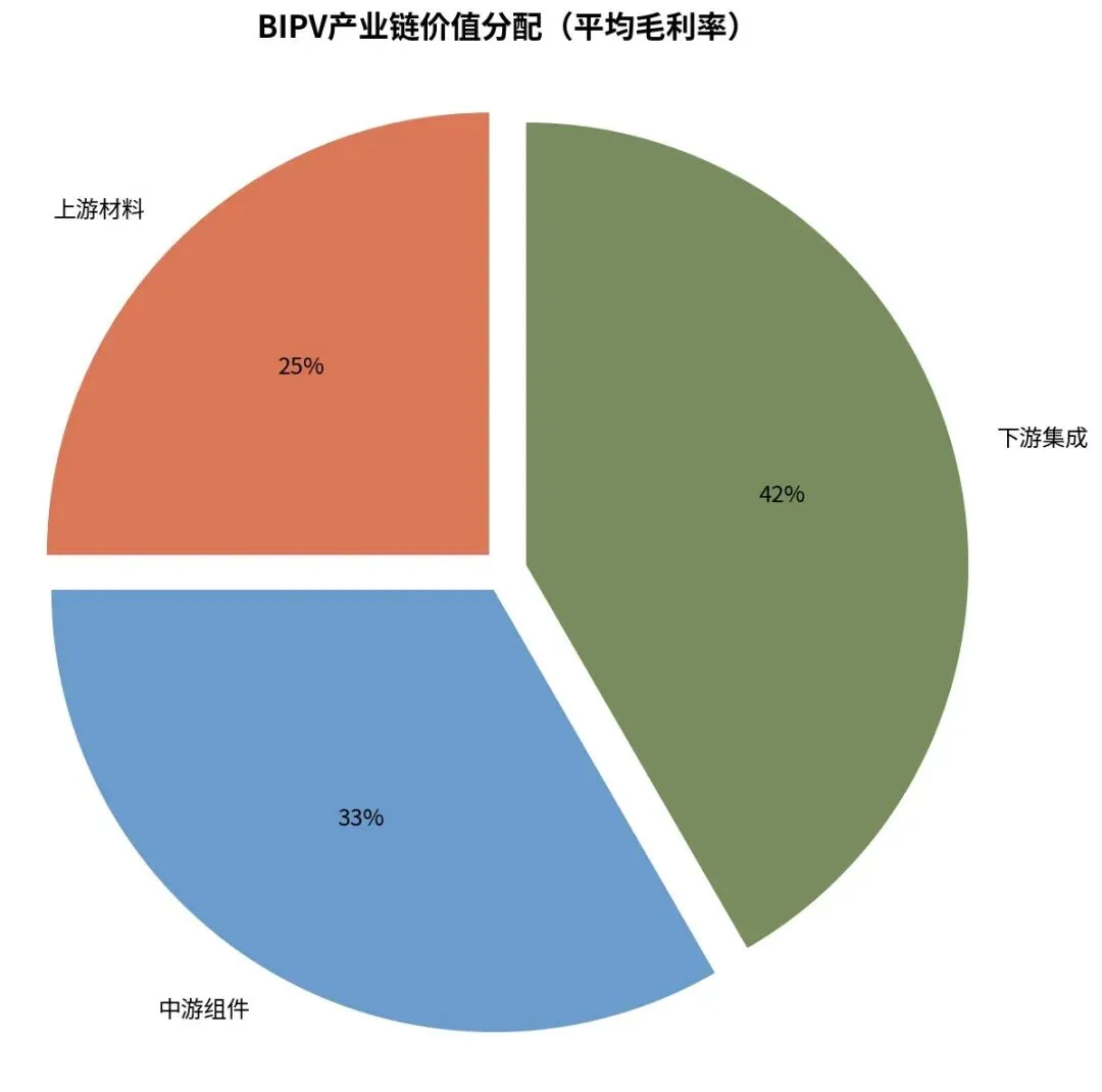 上游材料(光伏玻璃、密封胶、边框)毛利率15%,中游组件(电池片封装、电气集成)毛利率20%,下游集成(设计、施工、运维)毛利率25%。高性能光伏玻璃、轻质组件、智能逆变器、监控系统需求增长最快。
