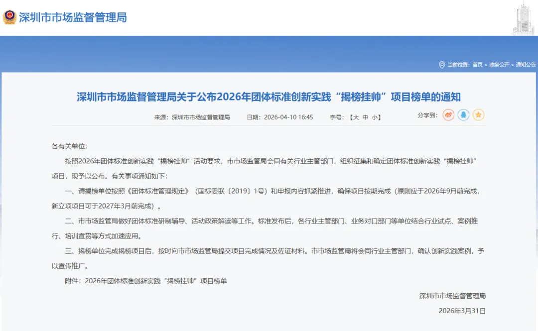 团体标准创新实践 “揭榜挂帅” 项目,是深圳市聚焦产业高质量发展、强化标准引领作用的重要举措,旨在遴选具备较强综合实力的优质单位,承担团体标准研制、应用验证与创新实践等重点任务,以高标准支撑新质生产力培育,助力深圳打造具有全球竞争力的标准高地,为产业高质量发展注入强劲动力。