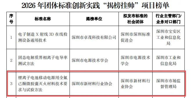 近日,深圳市市场监督管理局公布2026 年团体标准创新实践 “揭榜挂帅” 项目榜单,深圳市新材料行业协会凭借在新材料领域深厚的专业积淀、过硬的标准编制能力与广泛的行业影响力,成功入选,充分彰显了协会在推动新材料产业标准化、规范化发展中的核心地位与标杆引领作用!