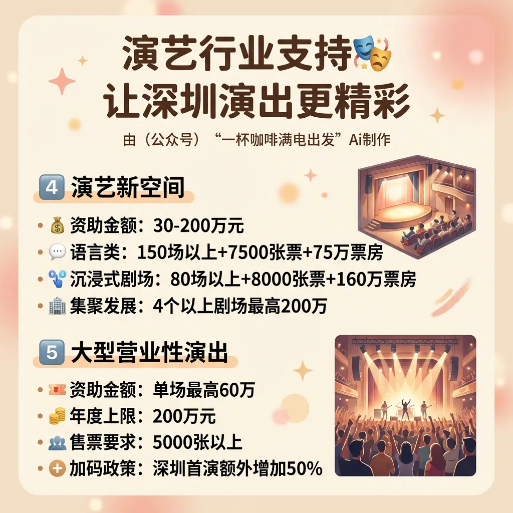 4.对于在深圳自主运营2个及以上演艺新空间授牌单位,上年度合计演出200场以上、售票总数16000张以上、票房收入160万元以上,或上年度合计演出200场以上、场所经营业收入400万元以上,分类给予最高150万元资助。
