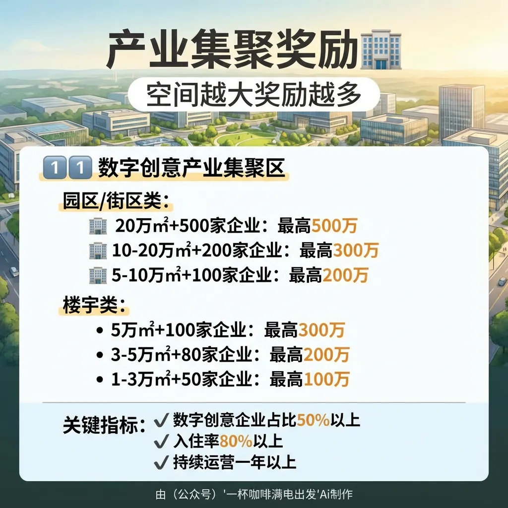 特色文化街区、产业园区类:空间规模超过20万平方米、集聚数字创意企业数量超过500家,给予最高一次性500万元奖励;空间规模10万-20万(含)平方米、集聚数字创意企业数量超过200家,给予最高一次性300万元奖励;空间规模8万-10万(含)平方米、集聚数字创意企业数量超过100家,给予最高一次性200万元奖励;空间规模5万-8万(含)平方米、集聚数字创意企业数量超过80家,给予最高一次性150万元奖励;空间规模3万-5万(含)平方米、集聚数字创意企业数量超过60家,给予最高一次性100万元奖励;空间规模2万(含)-3万(含)平方米、集聚数字创意企业数量超过50家,给予最高一次性60万元奖励。