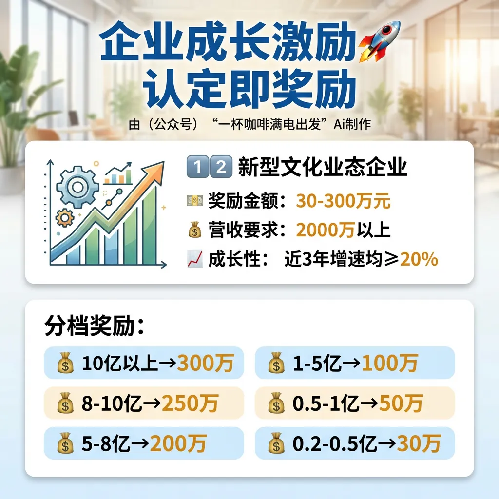 (二)资助标准:按企业规模和成长性情况,分档次给予最高300万元奖励。年营业收入超过10亿元的,给予最高300万元奖励;年营业收入8-10(含)亿元的,给予最高250万元奖励;年营业收入5-8(含)亿元的,给予最高200万元奖励;年营业收入1-5(含)亿元的,给予最高100万元奖励;年营业收入0.5-1(含)亿元的,给予最高50万元奖励;年营业收入0.2(含)-0.5(含)亿元的,给予最高30万元奖励。