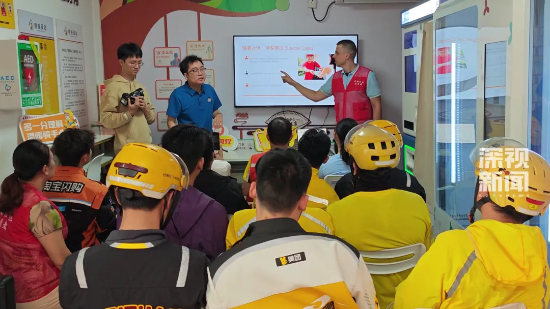 深圳市龙华区龙华街道景新社区党委委员刘梦介绍,社区常住和来旅游的外国人不少,“所以我们联合辖区剑桥英语培训机构,给快递、外卖骑手开展技能培训,让他们也能参与到APEC的服务保障当中。”