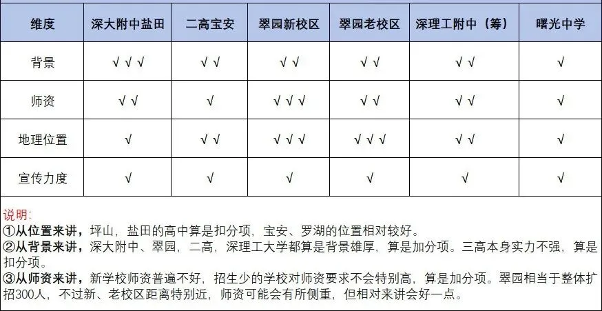 深圳今年有几所新学校,不少家长在问多少分?能填到什么位置?今天来说下新学校填报思路,仅供参考。招生情况:首届借址深大附中初中部,预计招生300人。招生情况:翠园新校区预计招生450人,翠园老校区预计招生600人。新学校首届分数线,和环境、学校位置、背景、师资,宣传力度有关。1、深大附中盐田,二高宝安,参考龙津中学(宝中分校),应该40大左右,运气好能到30+。2、深理工大学附中(筹),参考深北莫附中,首届招生也是招200,也是借大学校区办学,不过今年宣传力度比不上深北莫首届招生,分数线应该不如当年。3、翠园新校区,摆脱了翠园校园环境差的缺点,算是翠园的升级版,能稳定在前15,至于能否进十大不好说。翠园老校区,宿舍有所改善,但不如新校区,家长对于学校师资可能也存在疑虑,估计能在20大左右,看后续宣传。不过学校校名难评,翠园中学(爱国路校区)和翠园中学(东门北路校区),对于小白家长来讲,真的不知道该选谁。4、曙光中学,估计50大之后,看后续有无利好消息。具体怎么填?填哪里?