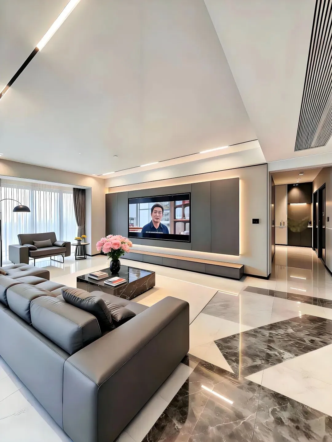 地面通铺的大理石瓷砖,灰白相间的纹理自然又高级,光脚踩上去凉凉的特别舒服。沙发选了灰色皮质的,简洁大气,搭配黑色的茶几,整个空间的色调就稳住了。电视背景墙也没做复杂造型,就是灰色面板加上隐藏式灯带,简约到极致反而最耐看。