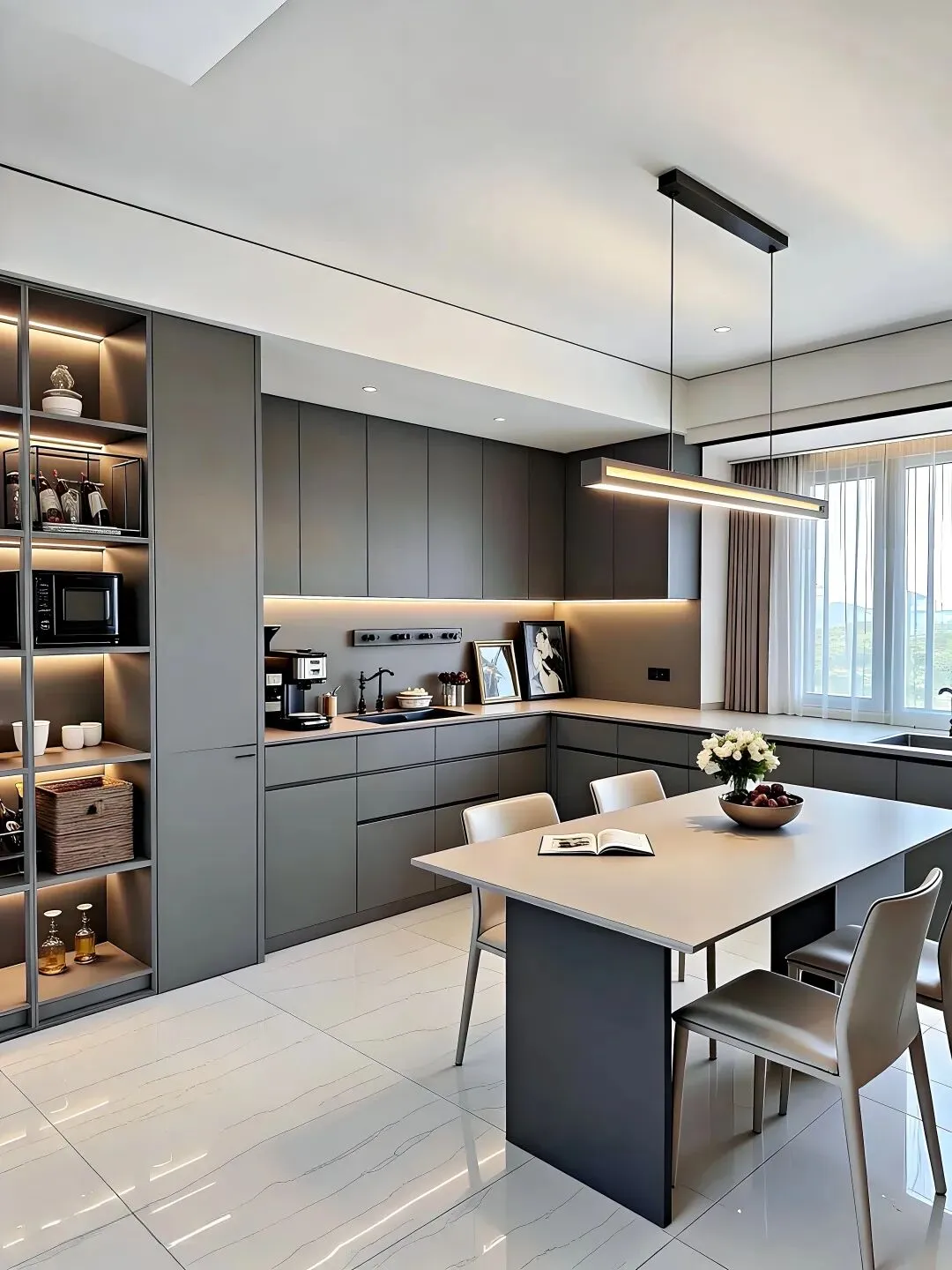 这家的厨房和餐厅做了开放式设计,整体延续了灰白调。橱柜选的是哑光灰,特别耐脏,台面是白色石英石,好打理又显干净。最聪明的是那个吊柜下面的灯带设计,晚上切菜再也不用担心光线不够了。