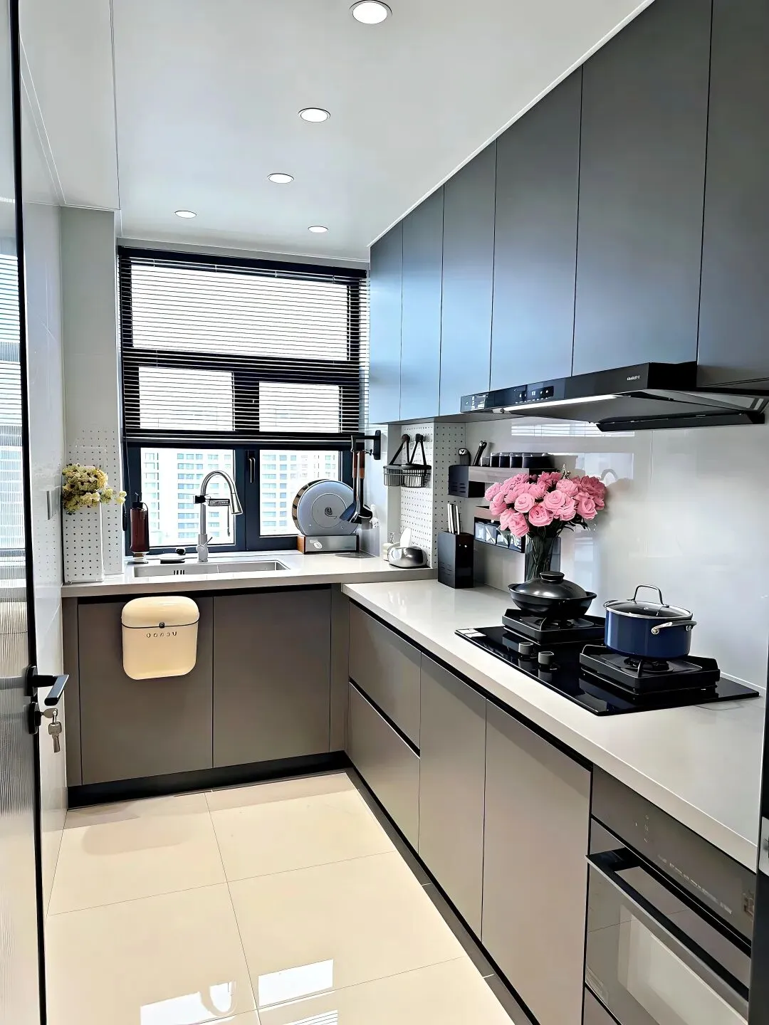 建议大家厨房一定要多做收纳,真的用不完。这家把犄角旮旯都利用起来了,水槽下面装了抽拉式垃圾桶,转角位置做了转盘,拿东西特别方便。住久了你就知道,收纳做得好,厨房能多用十年。