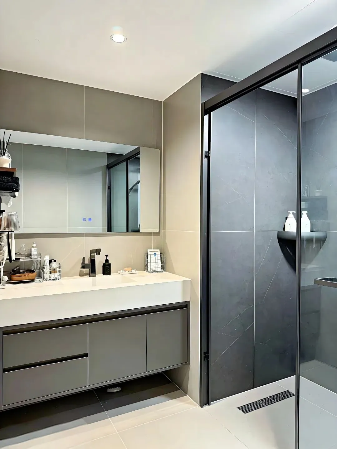 墙面贴了浅灰色的大砖,地面是深灰色防滑砖,耐脏又好打理。浴室柜选了悬空款,灰色柜体配白色台面,下面装了感应灯,晚上进来自动亮,特别人性化。镜柜后面藏了灯带,洗漱的时候光线刚刚好,不刺眼也不暗。