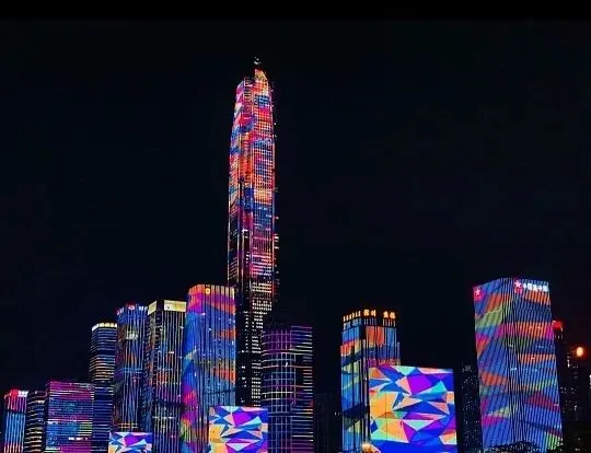 这光不是温和的,而是带着深圳特有的“速度感”——冷冽、华丽,鲜艳!像一股技术的洪流瞬间淹没所有感官。瞬间让人感觉置身在银河中,光影变幻,明暗交替,似乎在向所有人宣告:看,这就是现代都市的极致美学!
