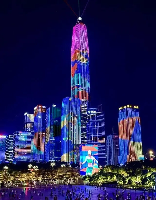 光不仅打在建筑上,也打在每一张仰起的脸上。我身边那个骑在父亲肩头的小男孩,兴奋地指着变幻的图案,瞳孔里倒映着整个城市的璀璨;那对依偎的情侣,在光影明灭间低声私语,也许这十五分钟成了他们忙碌生活中难得的浪漫片段;还有那位举着稳定器直播的年轻人,他不仅在看,更在向远方传递这份“深圳印象”。有位朋友是第一次看,看着他拿着手机,开着视频兴奋的给远方的家人看,我心中莫名的升起一股自豪感。为自己,也为深圳!