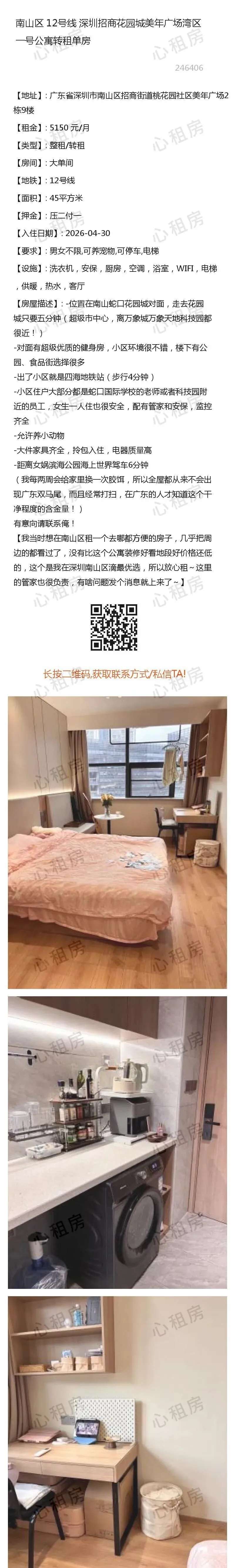 深圳租房【南山4则】房源①:12号线深圳南山招商花园城美年广场湾区转租单房5150元/月;房源②:…