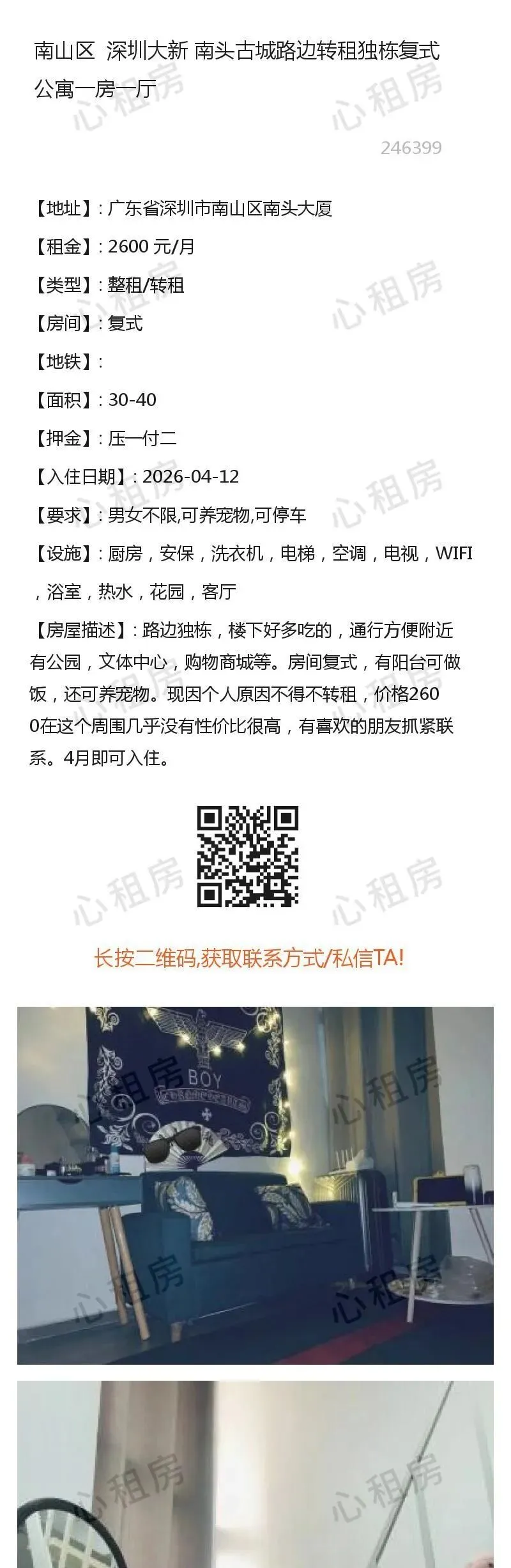 7、近期有人冒充我团线下工作人员,在此特别提醒:本公众号/心租房(homhere.cn)仅提供信息发布,不存在线下工作人员提供服务,请务必谨慎、切勿上当被骗。8、切勿轻信他人,点击他人提供的链接、二维码等,切勿按照他人指示提供验证码、进行转账等操作,谨防上当受骗。9、如遇提供虚假信息、冒充我团工作人员、引诱点击其他网站链接、实施诈骗等行为的,请及时在本公众号对话框里回复:Y,与我团客服联系。 查看不同房源→→深圳心租房公众号