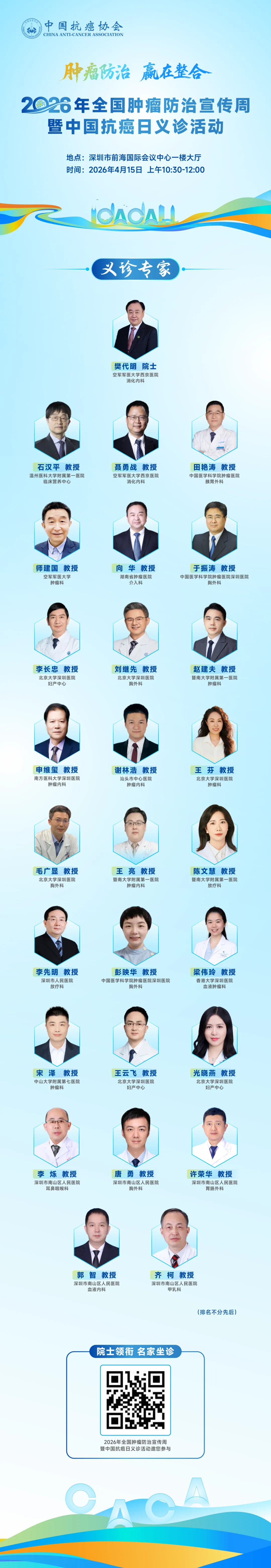 2026年全国肿瘤防治宣传周暨中国抗癌日期间,协会将于4月15日(星期三)上午10:30-12:00,在深圳市前海国际会议中心一楼大厅举办大型公益义诊活动。活动当天,樊代明院士携手20余位国内肿瘤诊疗领域权威专家,为广大患者提供面对面的专业诊疗咨询与科普答疑,以仁心妙术扶生,以科学科普护航。