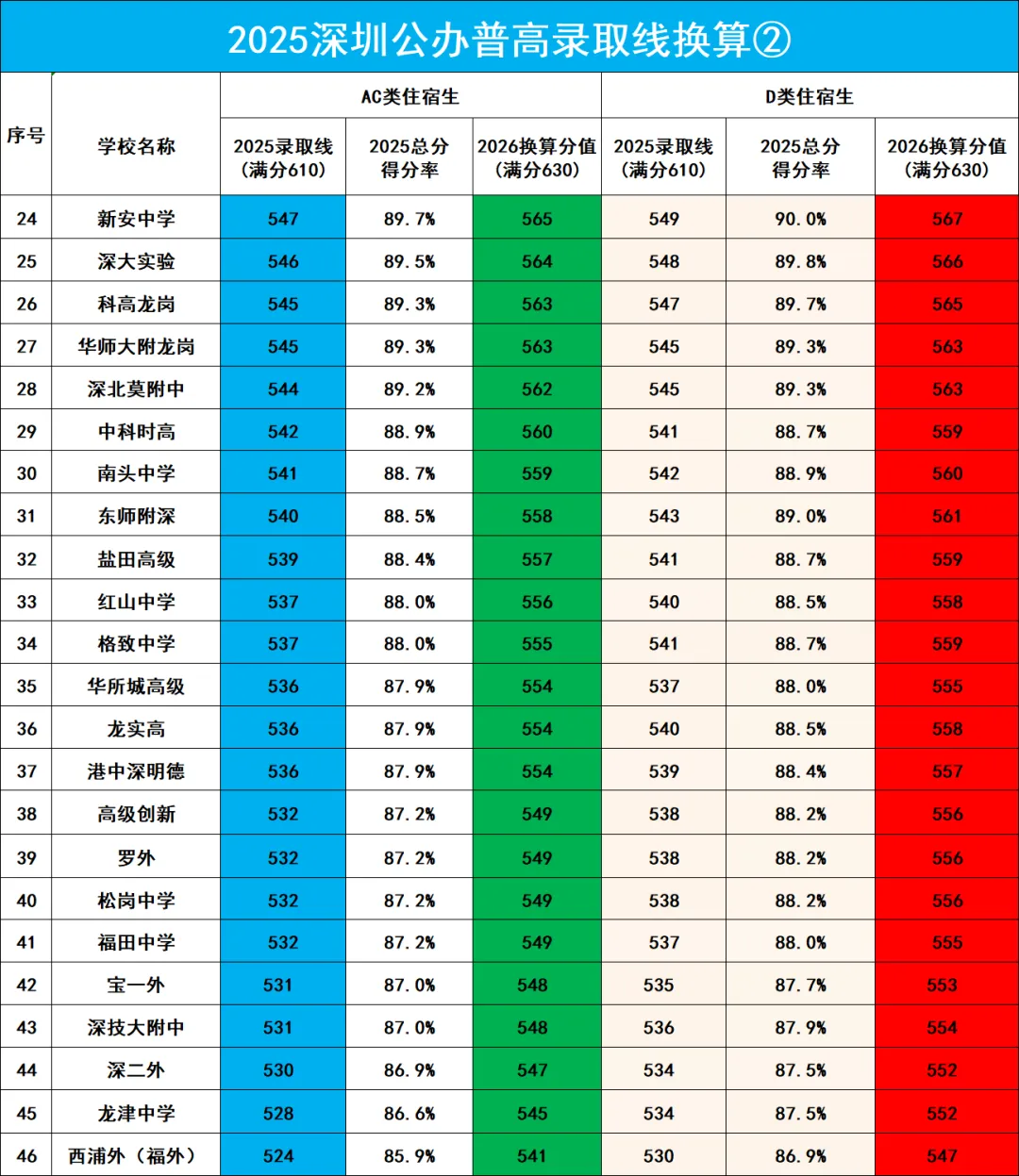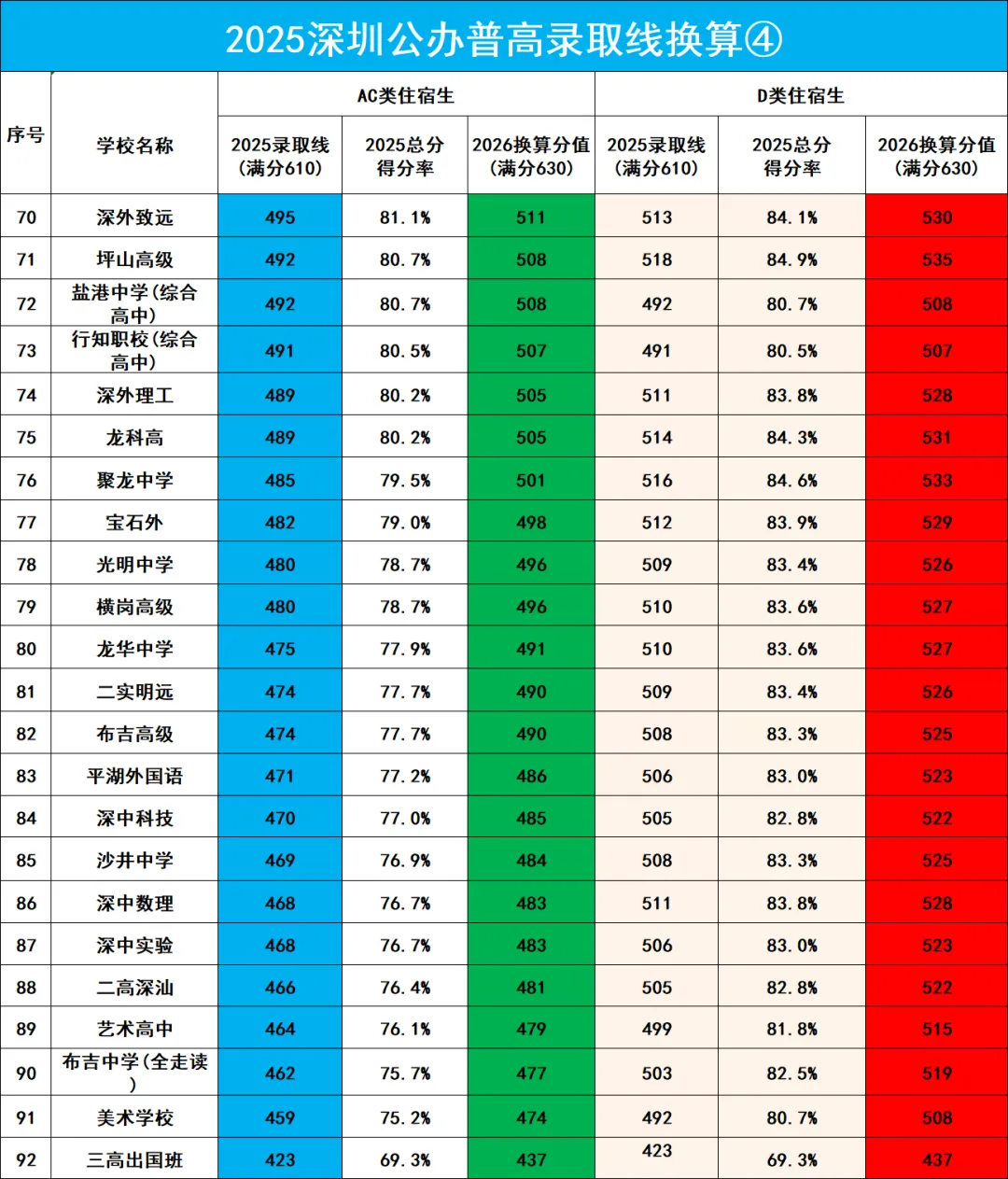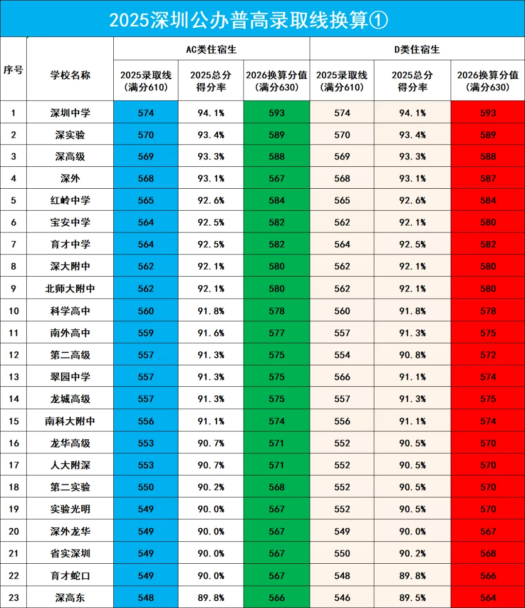 2025年深圳中考公办高中录取分数线对照2026年(满分630分)换算