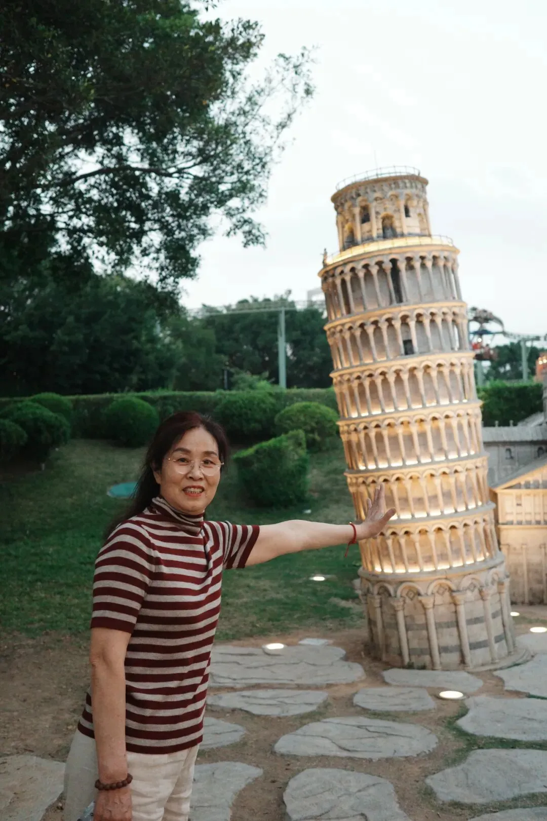 一落地深圳,下午我们就直奔世界之窗,一直玩到晚上九点半才往回走,脚都走酸了,可心里头特别兴奋。这里把全世界有名的建筑都浓缩在了一起,走到哪都觉得新鲜。在比萨斜塔跟前拍照的时候,闺女还调皮地教我,让我伸手比划着推塔。