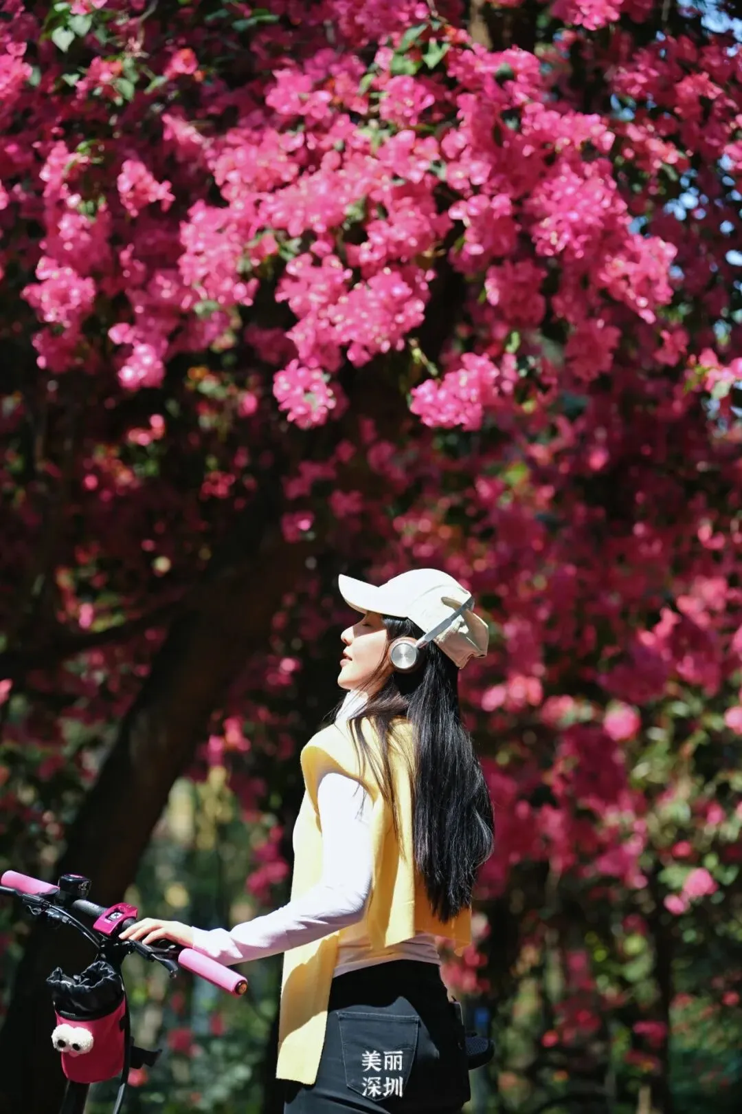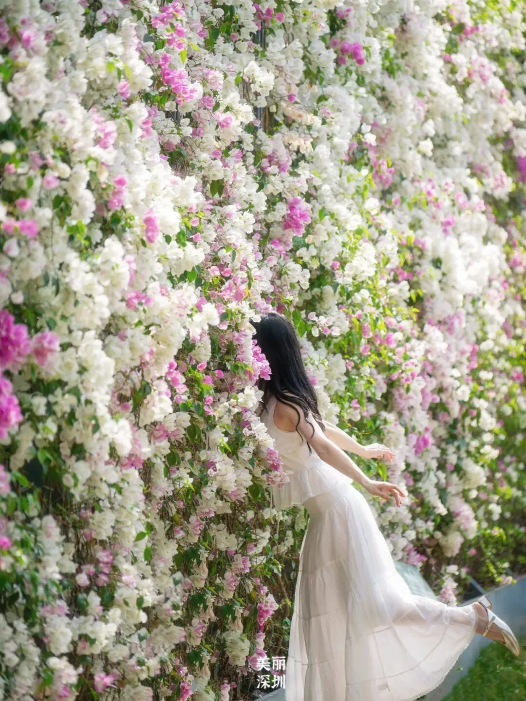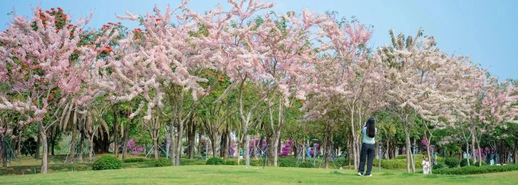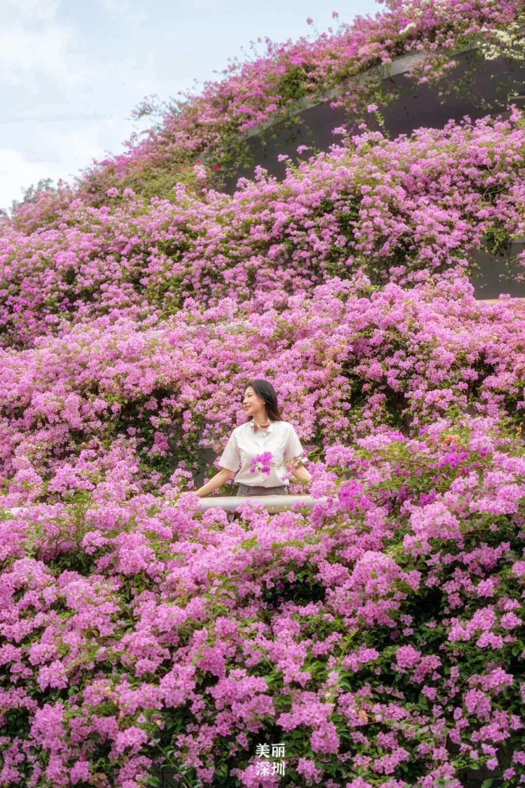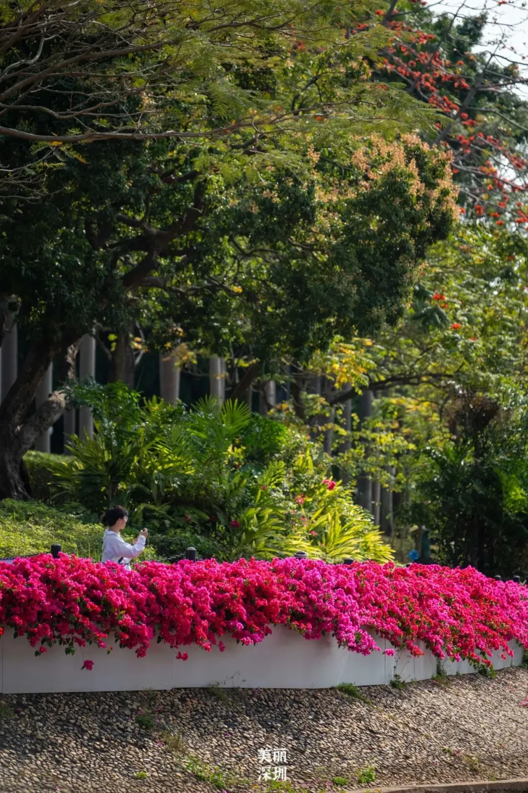 在来深必逛的莲花山公园里,簕杜鹃花墙吸引游人来打卡,游人们一头扎进去,仿佛闯进了“春天”的片场。园博园,岭南风情的建筑与簕杜鹃交相辉映,鲜花瀑布每年都会如约盛放。
