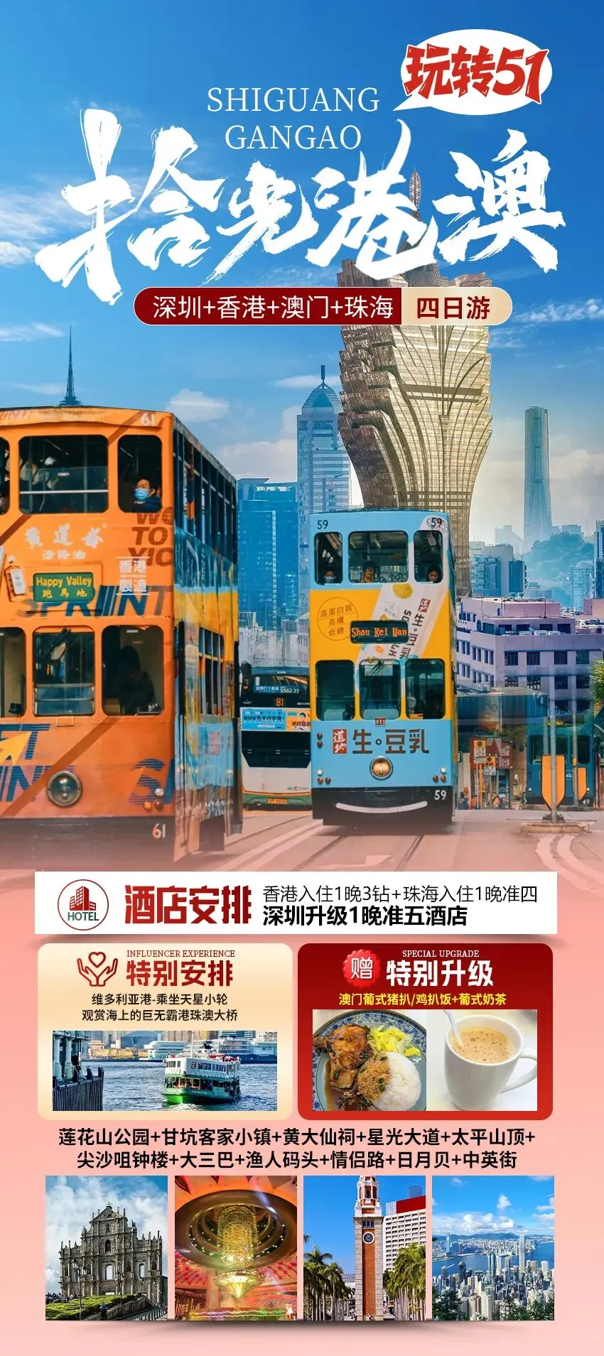 早餐后,指定时间集合,乘坐巴士前往港珠澳大桥香港口岸。经港珠澳大桥乘坐金巴前往澳门。