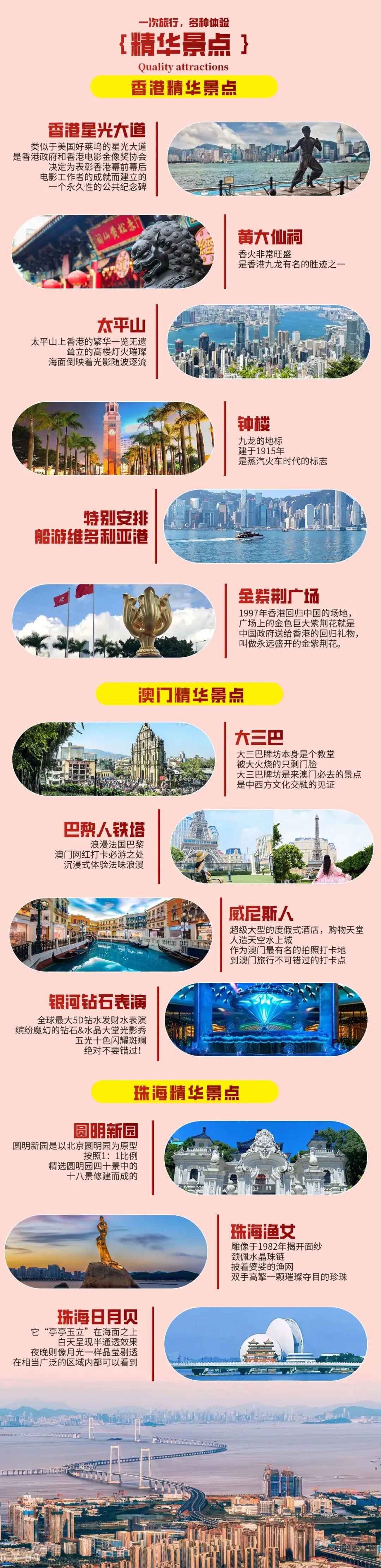 乘坐过桥专用旅游大巴经【港珠澳大桥】往澳门,沿途游客可在车上欣赏这个“新世界七大人工奇迹”之一的{港珠澳大桥},港珠澳大桥是连接香港大屿山、澳门半岛和广东省珠海市的大型跨海通道。