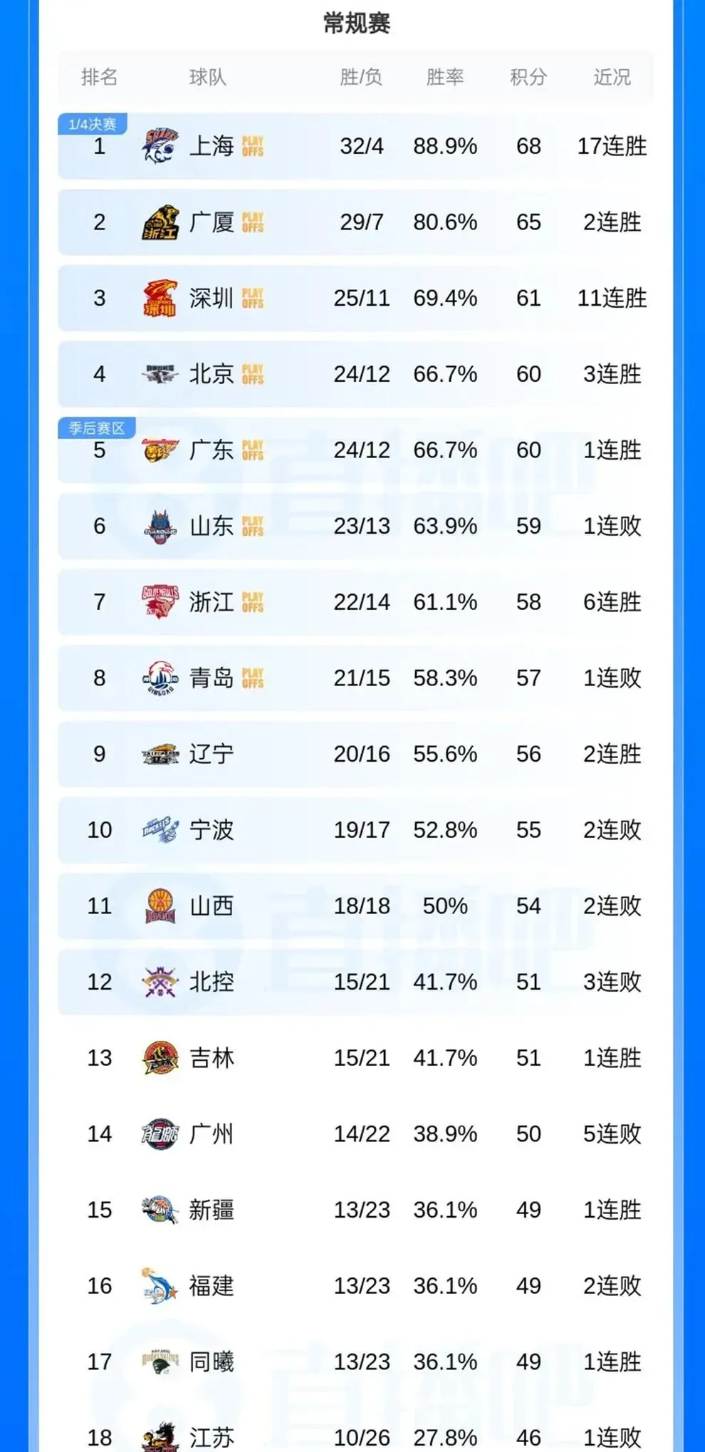 这两场比赛的结果直接改变了积分榜的格局。 上海队以32胜4负的战绩继续领跑,他们已经取得17连胜,主场战绩达到19胜0负,保持全胜。 广厦队29胜7负排在第二位。 这两支球队组成了争冠的第一集团,并且都已经提前锁定季后赛席位,获得了直接进入八强的资格。