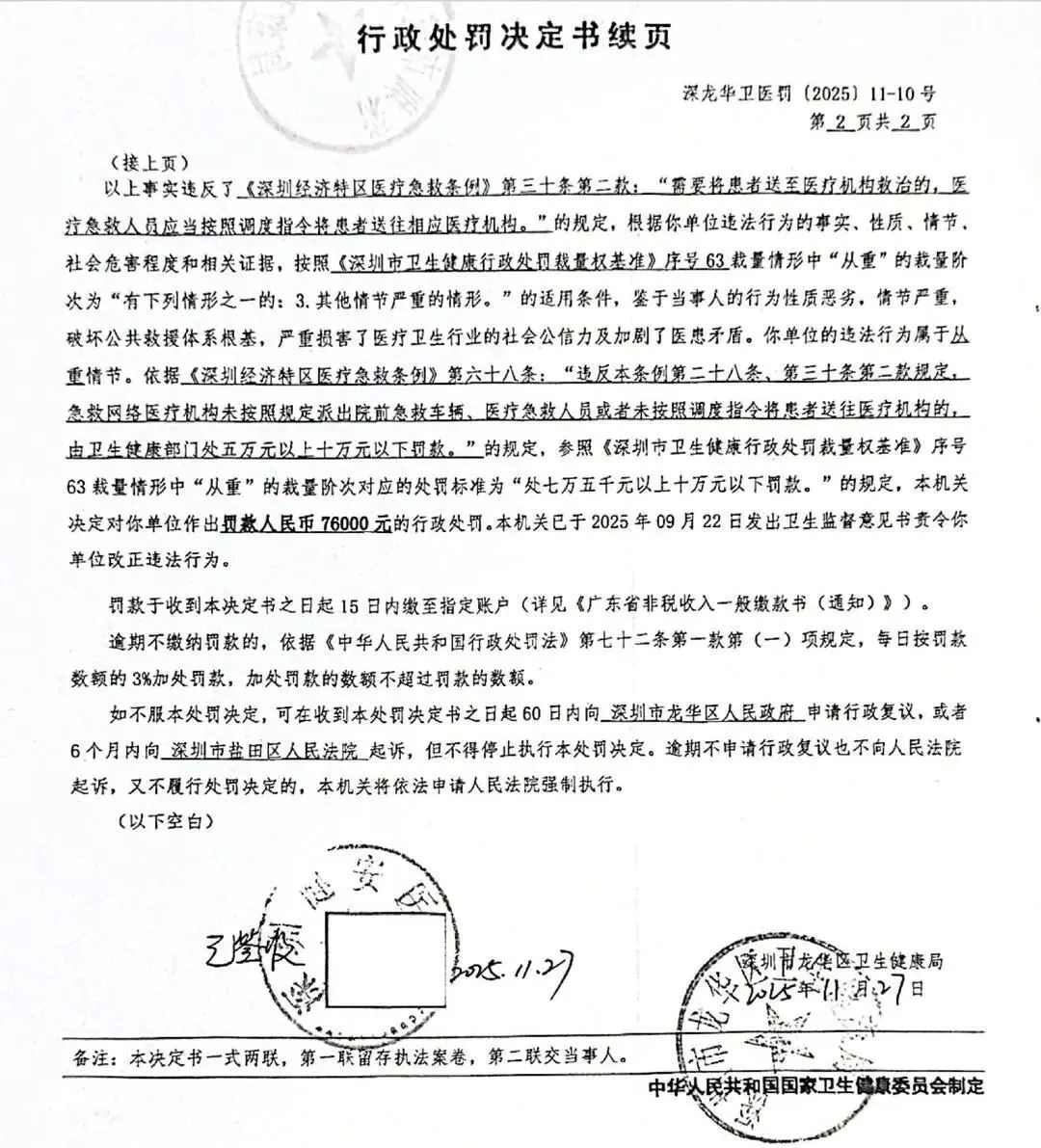 事发三个多月后,涉事深圳某医院因违反深圳市医疗急救相关条例受到行政处罚。据信用中国网站公示信息,深圳市龙华区卫生健康局于 2025年11月27日发布行政处罚决定书,经查实,“深圳某医院在 2025年8月5日转运患者张某某时,未按医疗急救调度指令将患者转运至指定的龙华区人民医院救治。”