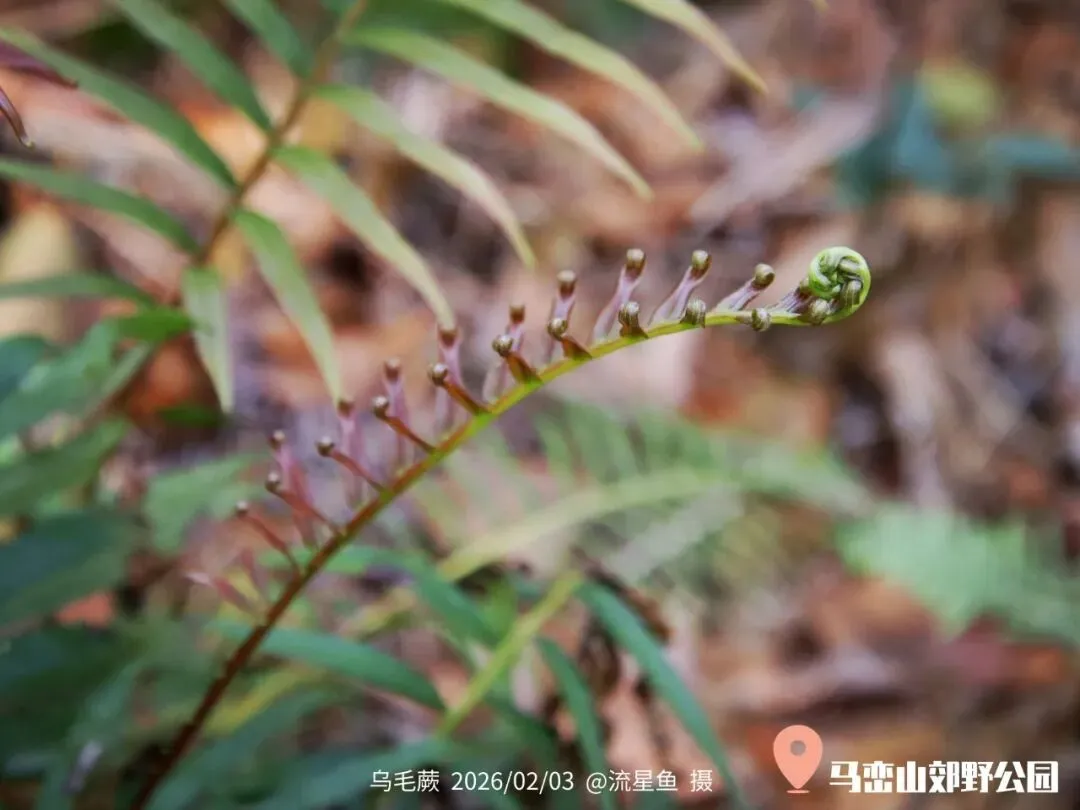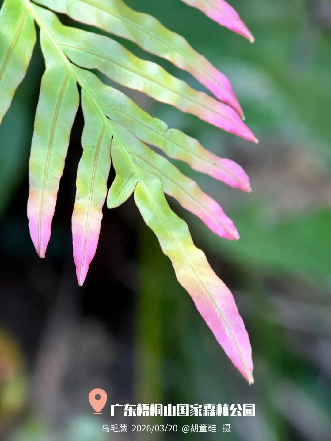 乌毛蕨是深圳山林中常见的蕨类植物。春季开始进入生长旺期,它的幼叶呈亮眼的红色,如同其他蕨类一般蜷曲成可爱的 “婴儿拳头” 形态,萌趣可爱。本次春叶专题共收录 9 条乌毛蕨记录,位列第三。