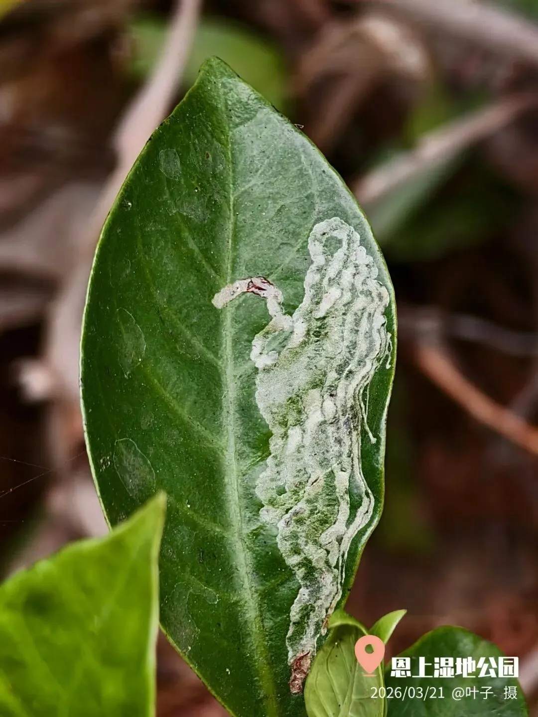叶面可见潜叶蝇幼虫取食形成的蜿蜒虫道,因取食叶肉叶绿素而呈白色;虫道前窄后宽,随幼虫生长逐渐拓宽,恰似潜叶虫的“自然笔记”。