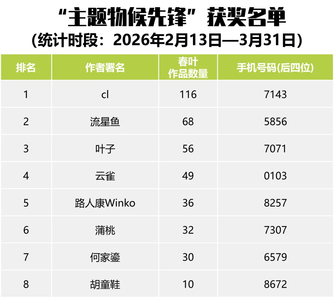 根据本次春叶专题上传的作品数量、物种数量、记录信息等,评选出了“季节同行者”(平台季度作品数量前八)、“主题物候先锋”(专题作品数量前八)、“识叶达人”(记录物种数前三)、“科普达人”(分享科普知识)、“独具慧眼奖”、“自然诗意奖”、“最美色彩奖”,获奖者名单及获奖作品公布如下: