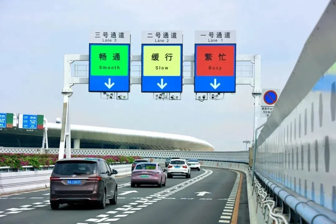 在离港平台的高架桥上,共设置了三处智慧引导屏——