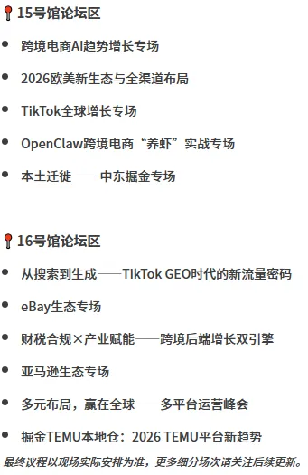 亚马逊、Ebay、TikTok、TEMU等TOP20跨境平台招商及品类经理现场坐镇,可直面官方团队,破解店铺审核与运营难题。