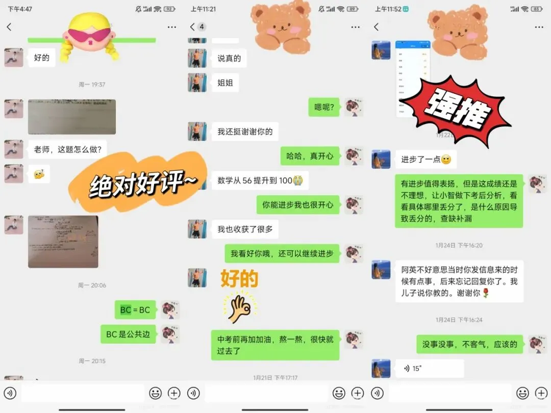 针对学生数学成绩在八九十分徘徊、缺乏系统知识梳理的问题,提供针对性答疑和薄弱环节强化训练。经过辅导,学生成绩稳步提升至110分左右,学习信心明显增强。
