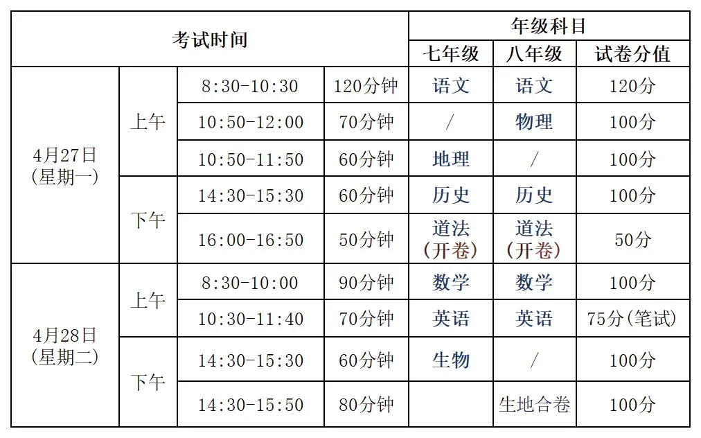 南山区初一初二考试时间
