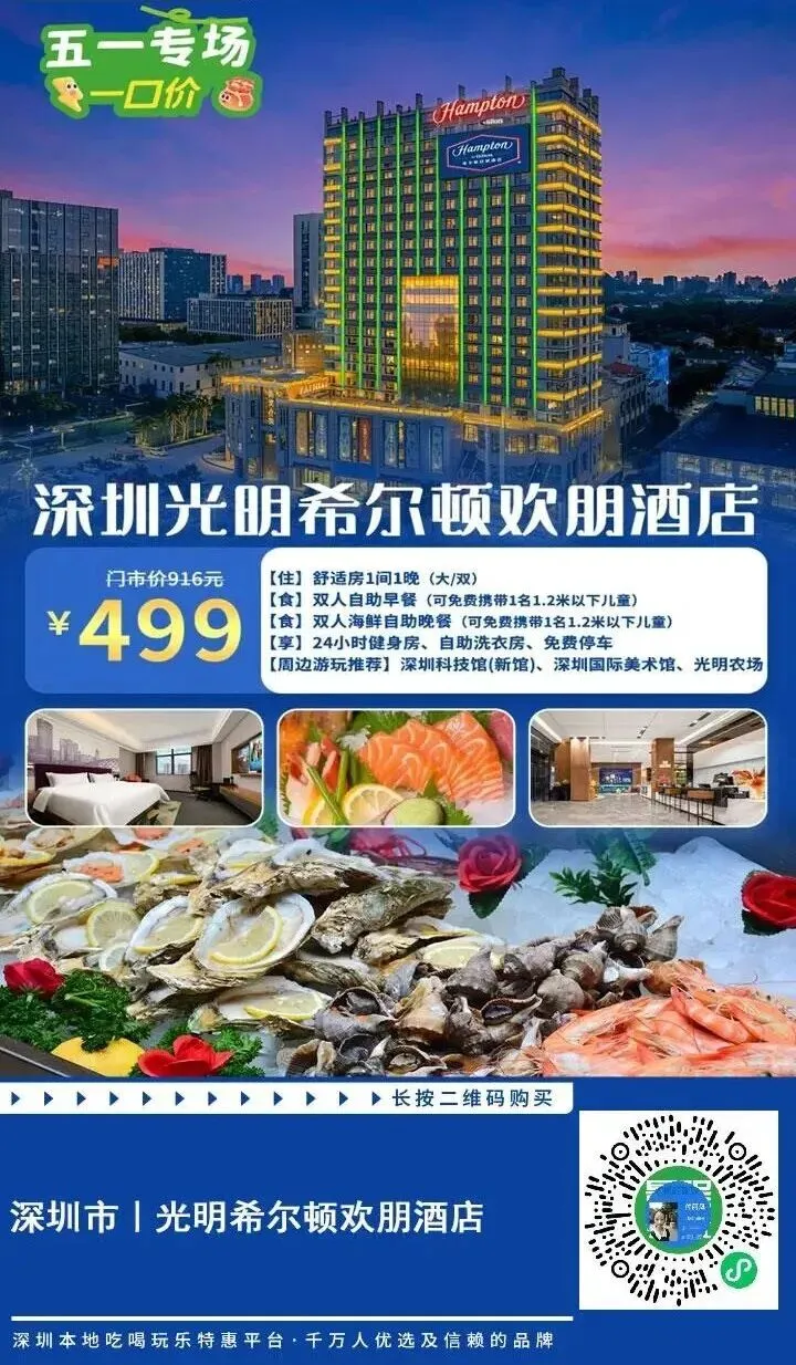 深圳特价酒店深圳光明希尔顿欢朋酒店 ¥499住国际品牌+2大1小自助早餐+海鲜自助晚餐!(含双早+海鲜自助晚餐)](购买截止时间2026.5.5)