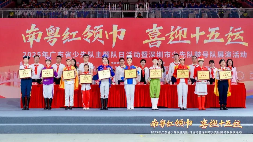 2025年6月,珠光小学鼓号队在“南粤红领巾喜迎十五运”2025年深圳市少先队鼓号队花样操比赛中,以高分斩获花样操金奖第一名。120名队员以“智慧AI”“星火传承”等创意图景,将红色基因与科技元素巧妙融合,生动践行“五育融合、科创见长、红脉延续”的育人理念,成为一堂德育美育示范课。