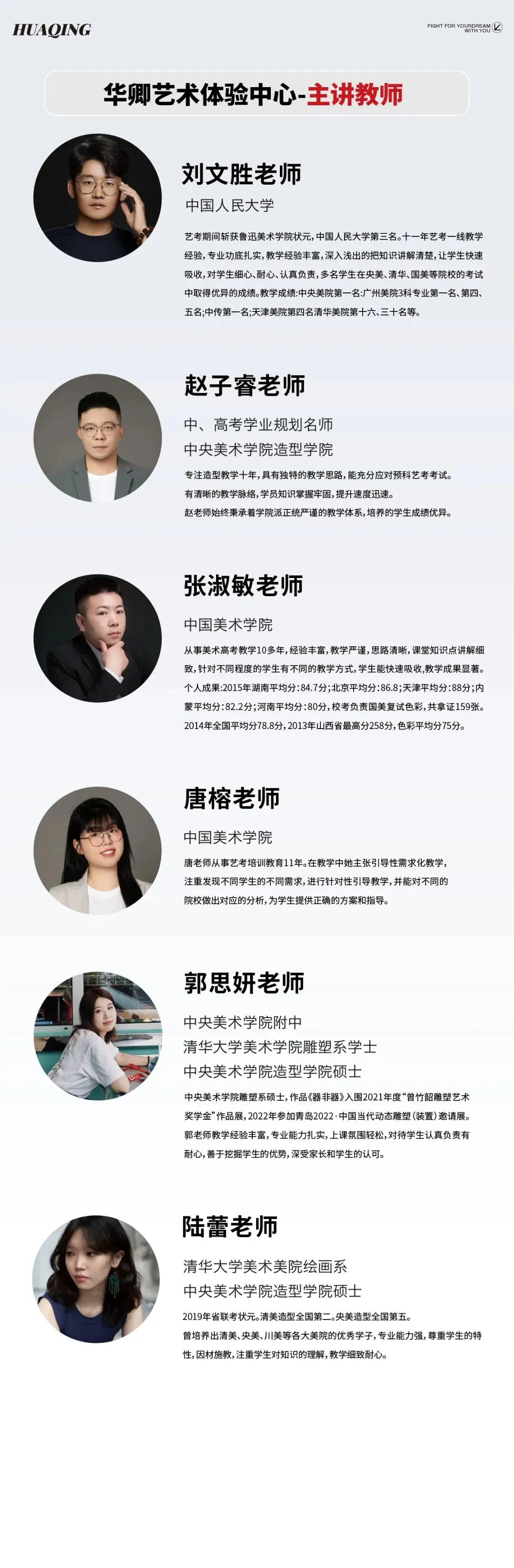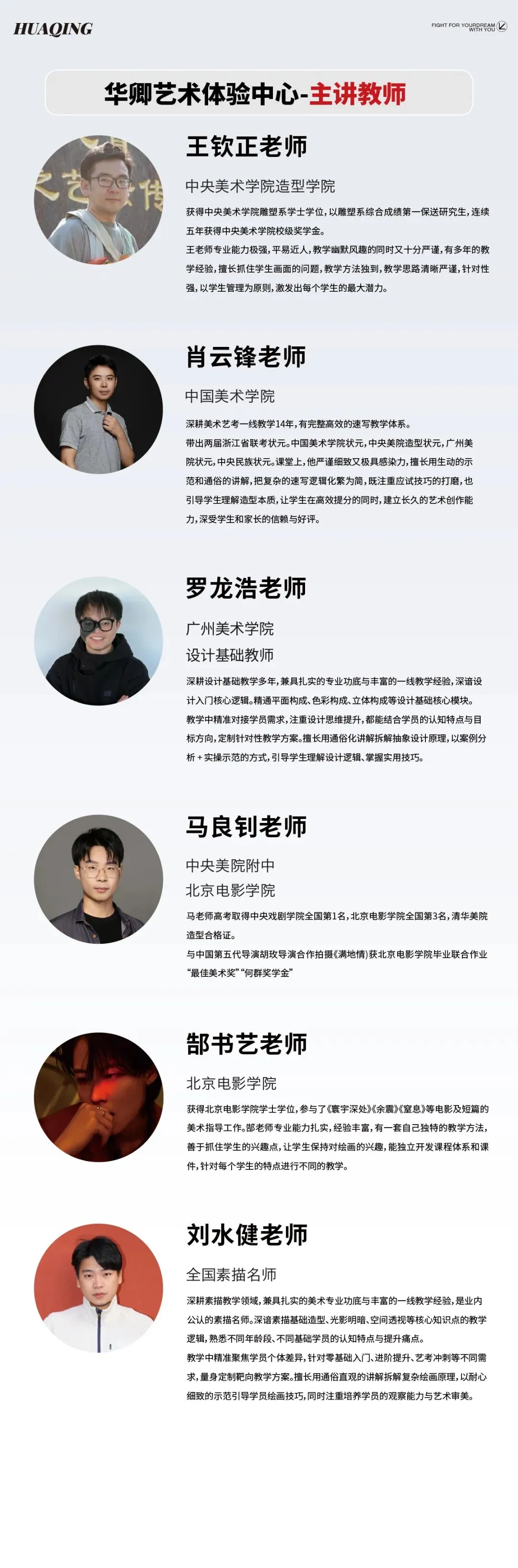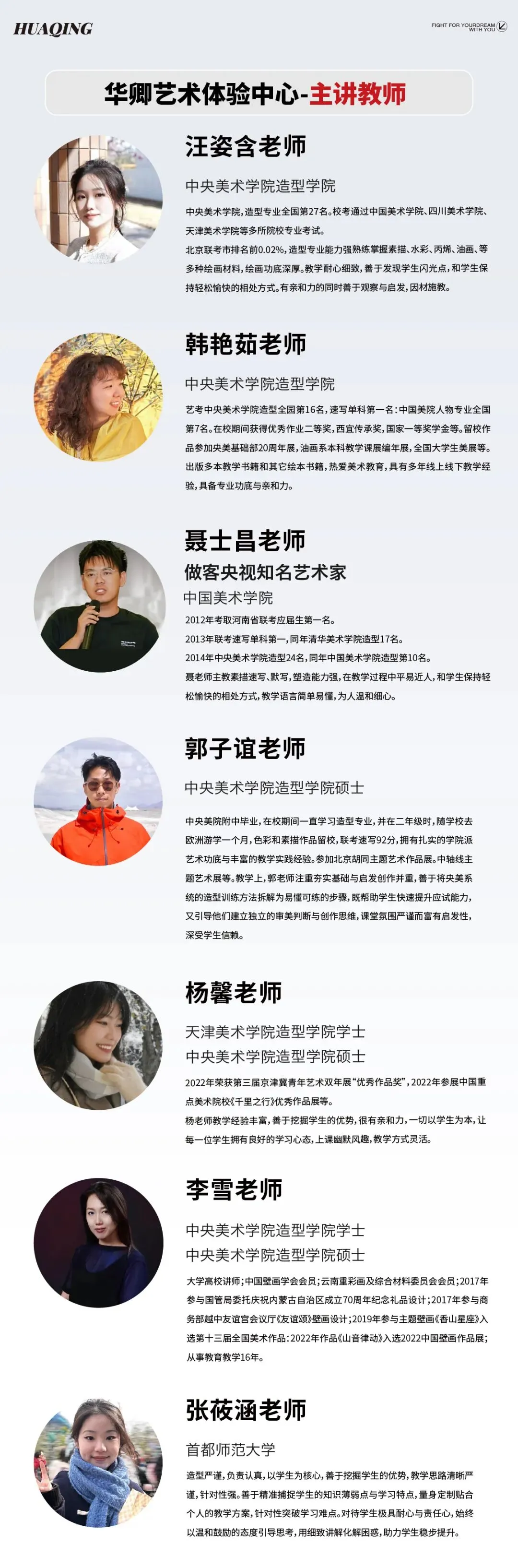 开设清华、造型、设计、影视、文修、实验、国画、建筑、动画、美术学、书法专业等全品类科目,满足每一位同学的考学需求,无数满怀艺术梦想的少年来到华卿,又从华卿走向全国各大美院名校。