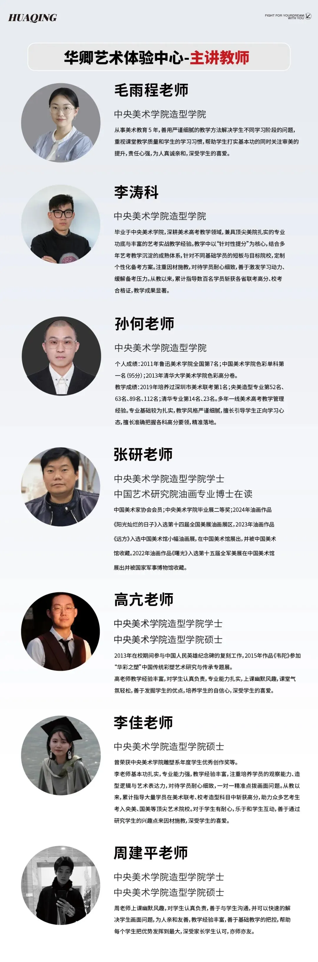 美育心传,点亮梦想,这是校长卢华卿的教学理念,也是每一个华卿人所奉行的准则。华卿画室,伴随了一代又一代美术生的成长,为全国各大美院名校输送大量优秀学子,如今,华卿已走过了25年,我们期待与更多的美术生在未来相遇,也期待与更多的青年艺术家一同携手培养更多的优秀人才!来华卿!一起拼!一定赢!
