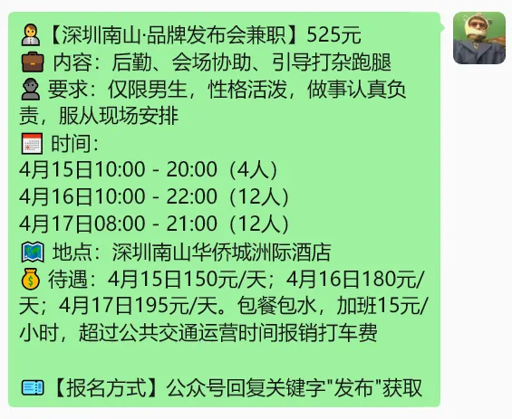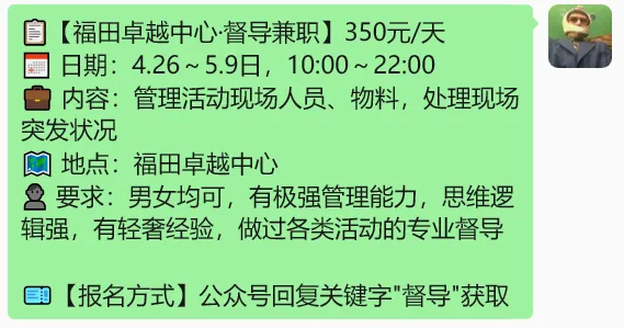 >【深圳兼职】230元/罗湖果汁店、200元/福田花店、300元/逛展会、525元/发布会、510元/演唱会、350元/活动督导、600元/环球设计大奖....