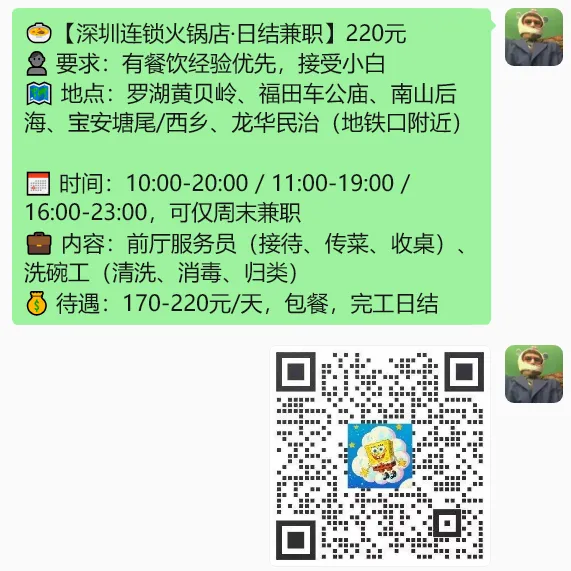 深圳餐饮招聘丨4月12日 宝安快餐主厨9K每月丨烧烤师傅8K每月丨福田服务员23/小时丨南山迎宾兼职20/小时丨餐饮服务员18/小时