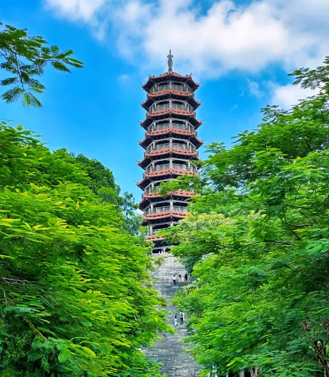 很多人来红花山公园,是为了去山顶的明和塔,明和塔有九层,是光明的标志性建筑,上山走环山步道,坡度平缓,沿途有勒杜鹃和紫荆花,