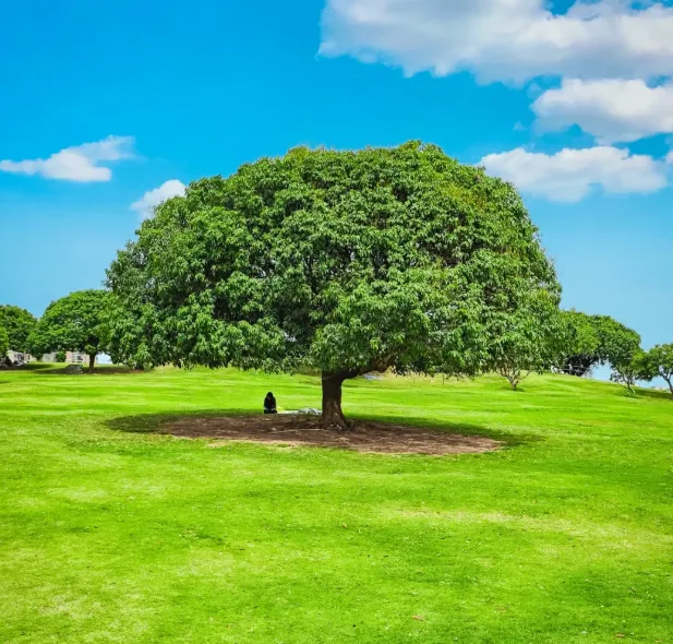 高大的树挡住了太阳,阳光透过树叶洒在地上,城市的噪音也听不到了。