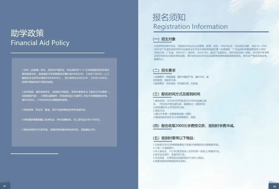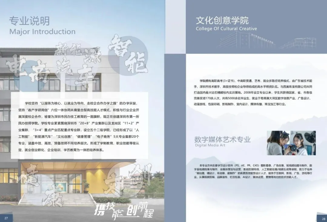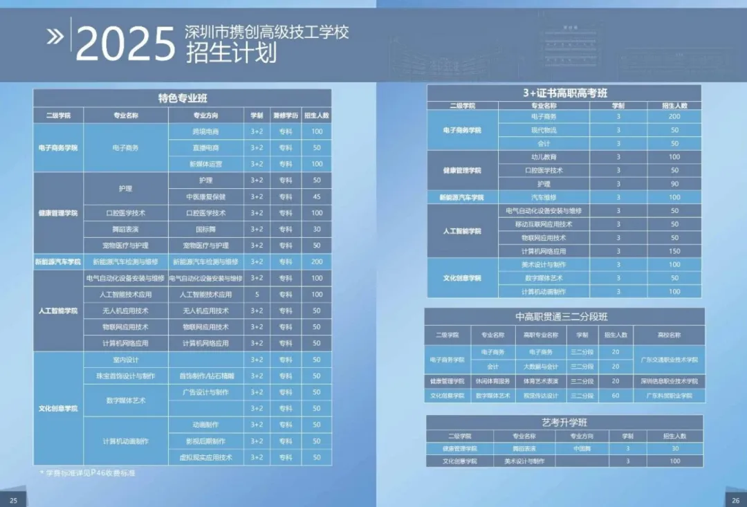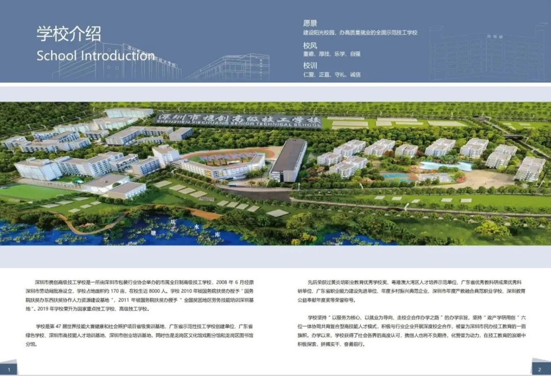 深圳市携创高级技工学校占地面积约170亩,在校生近8000人。2019 年学校荣升为国家重点技工学校、高级技工学校,被誉为深圳市民办技工教育的一面旗帜。深圳市携创高级技工学校招生专业:电子商务、护理、口腔医学技术、舞蹈表演、宠物医疗与护理、新能源汽车检测与维修、人工智能应用技术、物联网应用技术、电气自动化设备安装与维修、无人机应用技术、计算机网络应用、室内设计、数字媒体艺术、计算机动画制作、珠宝首饰设计与制作等21个专业、学制丰富。3+证书高职高考班