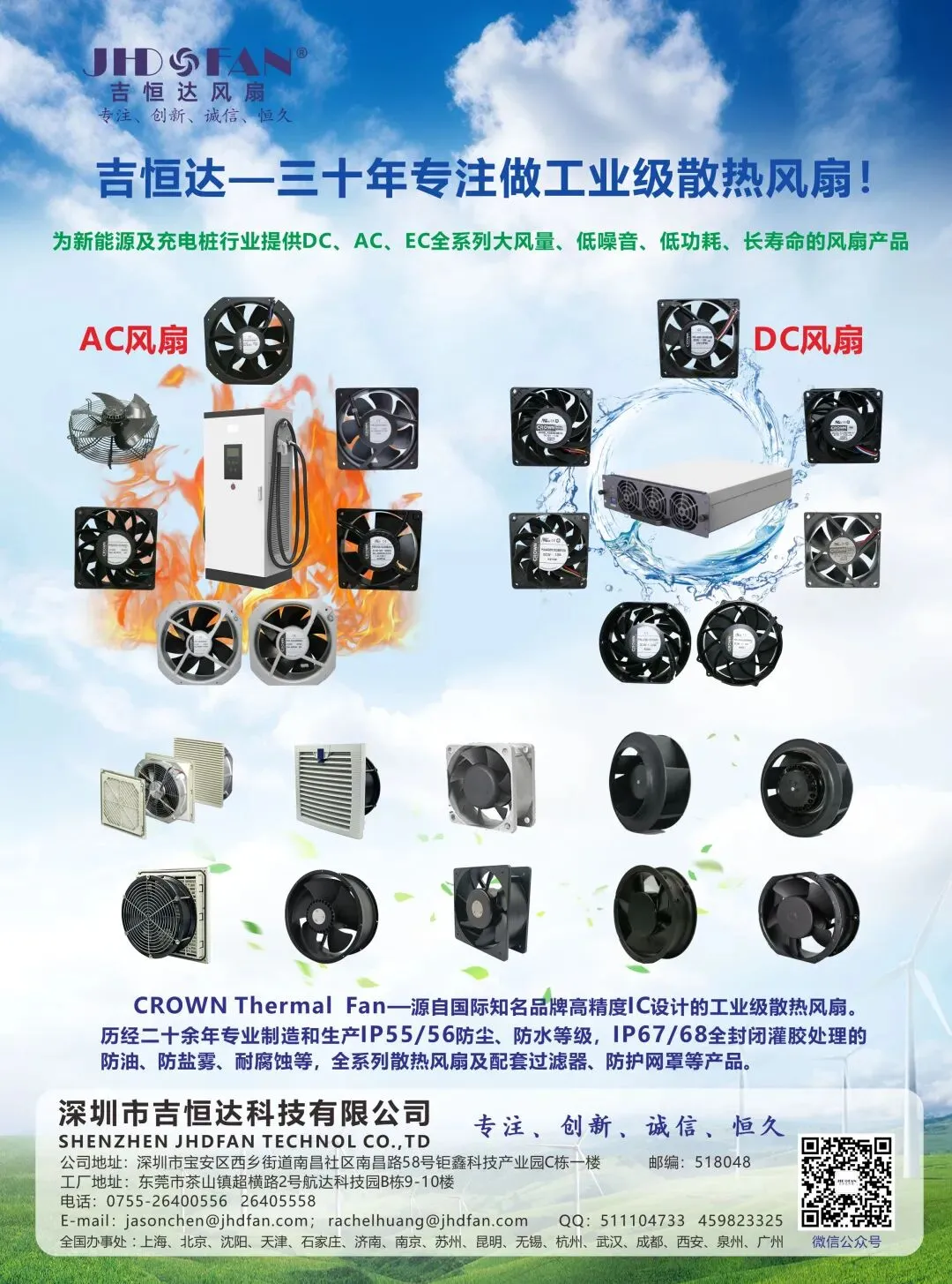 应用在新能源各个领域的全金属耐高温-40~+100°C直焊扇叶、铝合金扇叶的AC8038、9238、12038、15051、17251、16060、18065、20572、22580、25489、28080散热风扇。IP68/IP69K防水、防腐蚀、抗冲刷的全金属耐高温AC(EC)防爆风扇。IP55/56、IP67/68防水、防油、防腐蚀的全系列AC(EC)智能型、带PWM调速、RD告警输出、FG测速信号的高性能散热风扇。以及应用在数据中心的超大风量DC4056、6056、8056、8076(8080)系列飓风双胞胎风扇;全系列超静音DC风扇,以及防护等级达到IP44/54过滤器、防护网罩等产品。