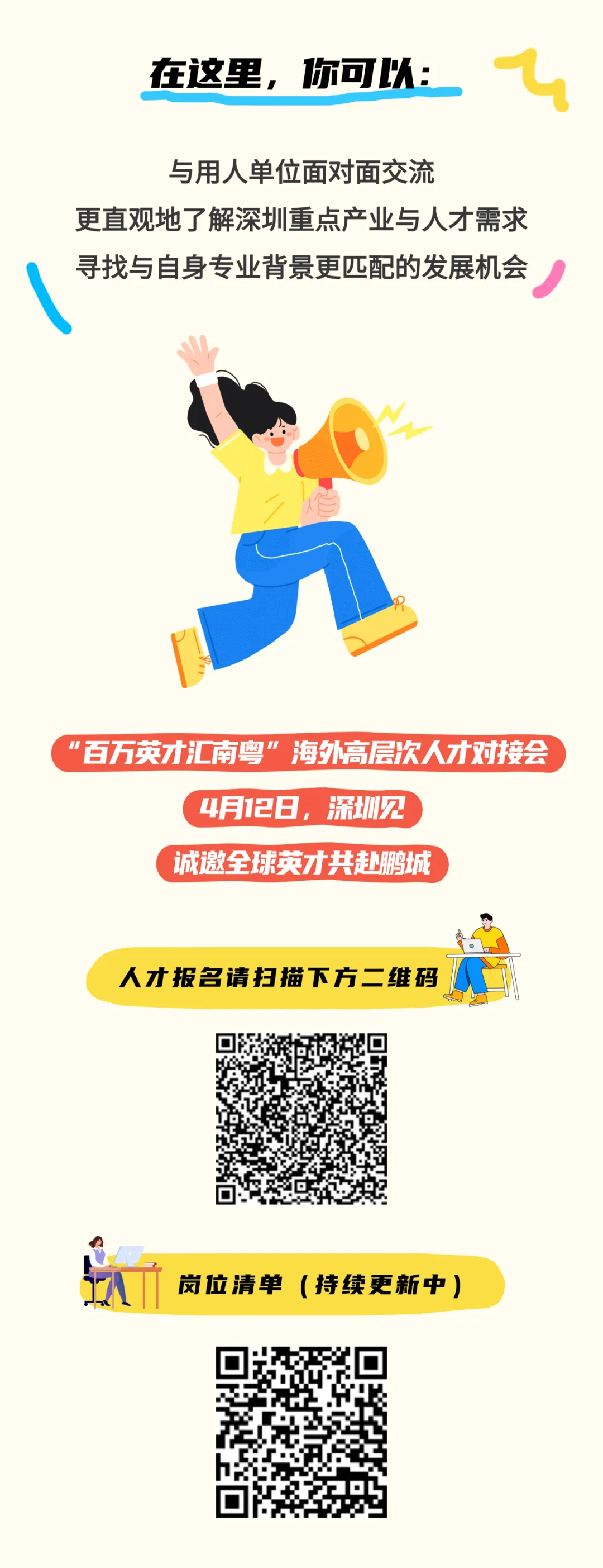 由市委统战部、市委组织部指导,深圳欧美同学会主办的“同深共圳”海外博士鹏城行活动即将启动,其中4月12日下午将举行“百万英才汇南粤”海外高层次人才对接会,邀请海外高层次人才来深交流对接、共话发展。