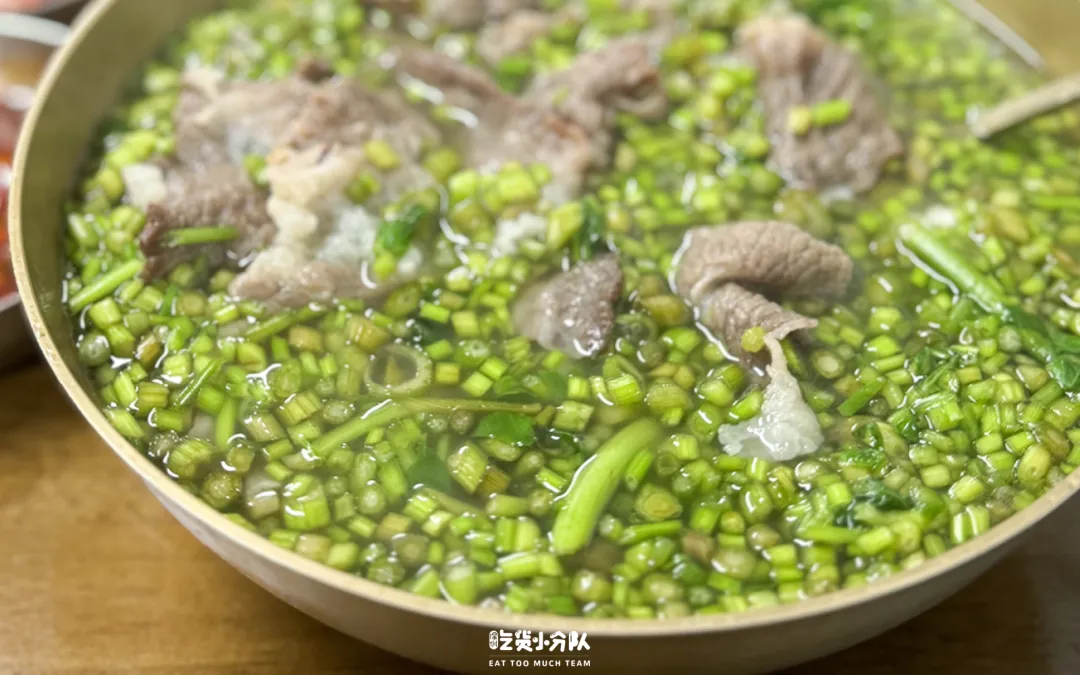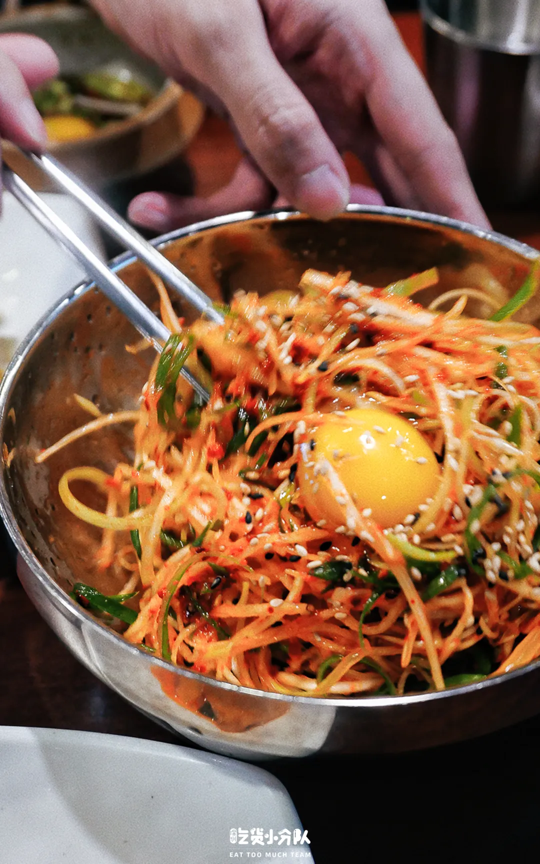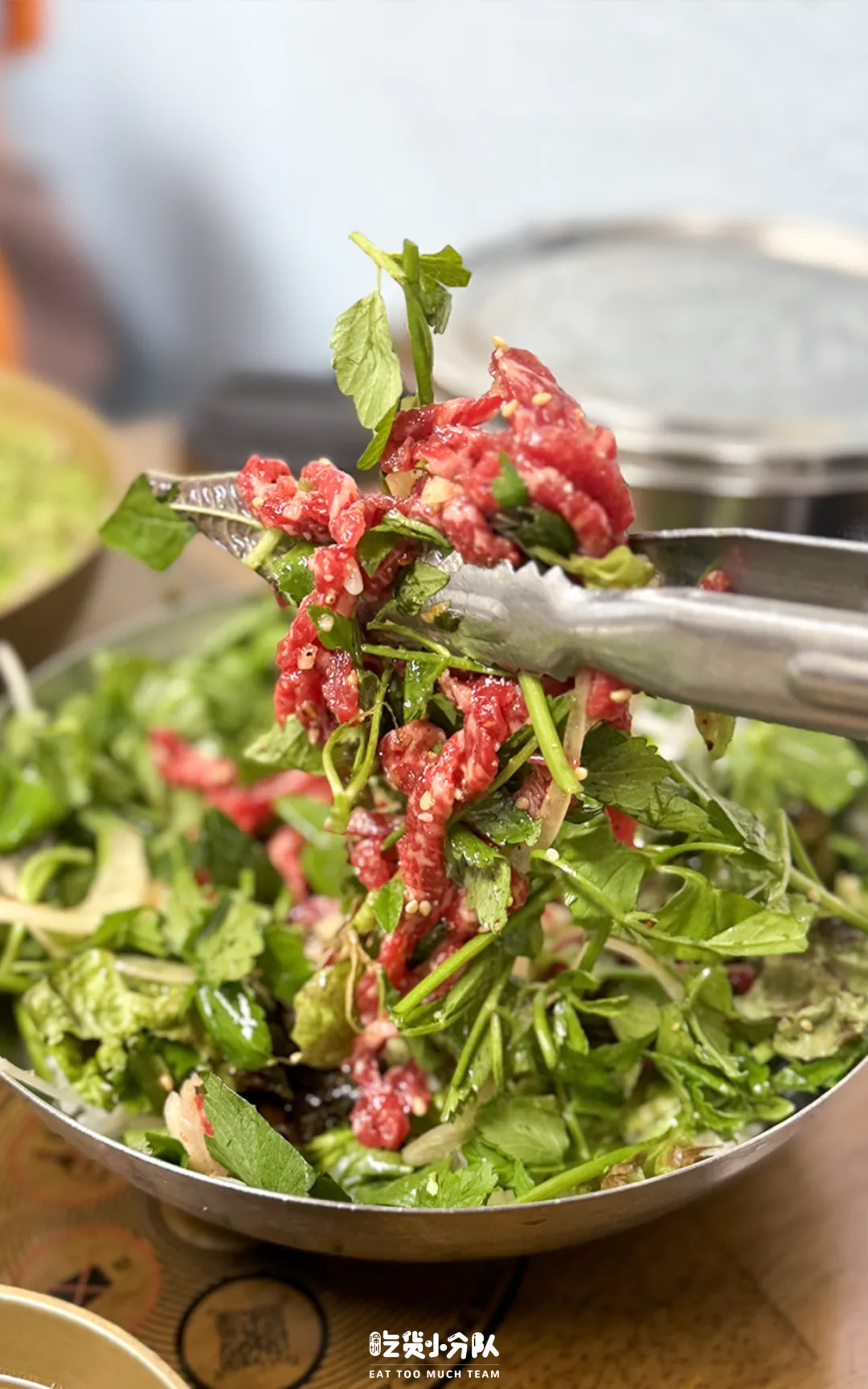 圣水洞很火的水芹菜料理,每到饭点都要就队。每桌必点的生牛肉拌饭和水芹牛骨汤,分量很给力,水芹菜汤里的牛肉很香糯,搭配上店内特制的酱汁调料,吃一口很上头。