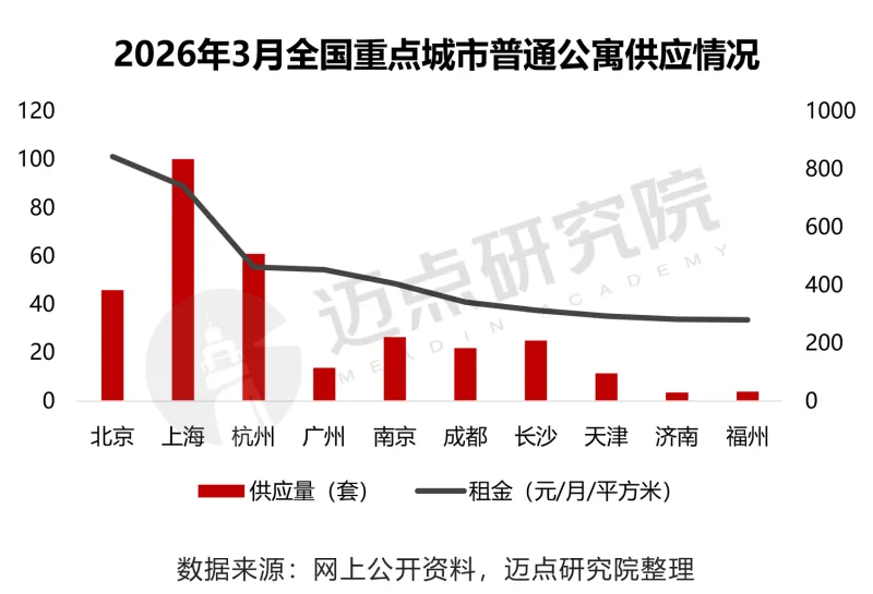 2026年3月,全国重点城市普通公寓供应与租金呈显著分化特征。 从供应量来看,上海、杭州、北京居全国前三位,分别供应836套、509套、383套;其余城市供应量均低于300套,济南、福州供应量规模垫底,市场供应集中度较高。 从租金来看,重点城市普通公寓平均租金为53.07元/月/平方米。具体来看,一线城市平均租金81.62元/月/平方米,显著高于市场均值;新一线城市平均租金40.83元/月/平方米。其中北京以101.34元/月/平方米的租金水平领跑全国,福州、济南租金垫底,梯队差距明显。