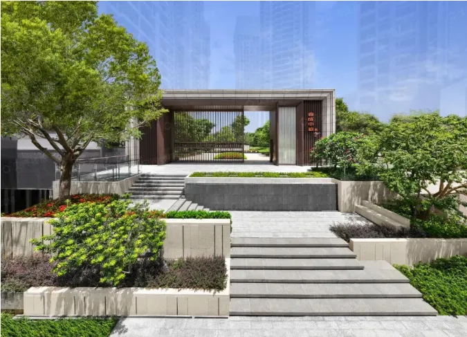 采用黄金麻石材打造约7.2米高入户门庭,步行台阶,近4m高差跌瀑水景,特设人性化无障碍通道及直梯,礼遇归家尊崇。