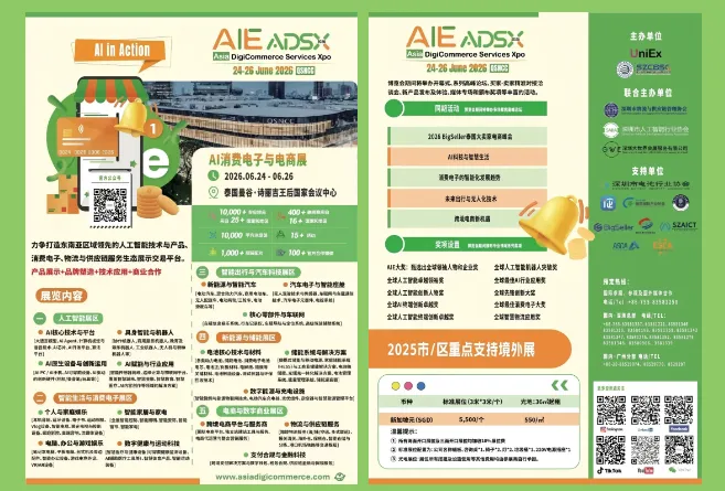 2026年第二届AIE ADSX“AI消费电子与电商展”展览内容涵盖人工智能、智能生活与消费电子、智能出行与汽车科技、新能源与储能、电商与数字商业展区。目前定档于2026年6月24日至6月26日,在泰国曼谷诗丽吉王后国家会议中心举行。