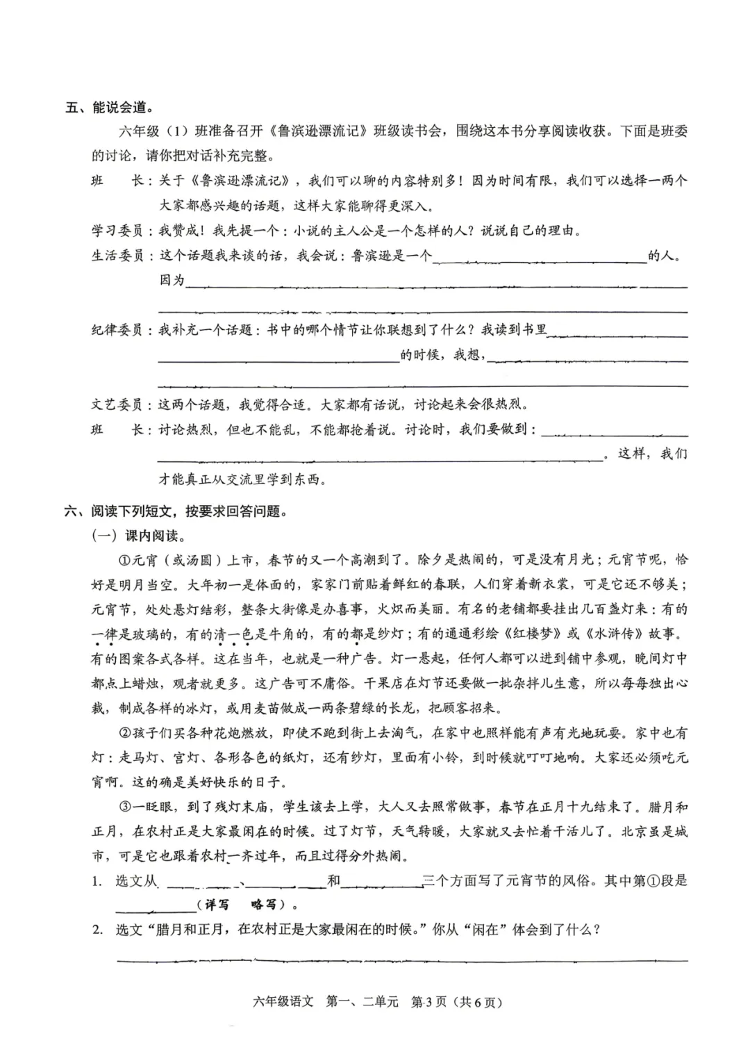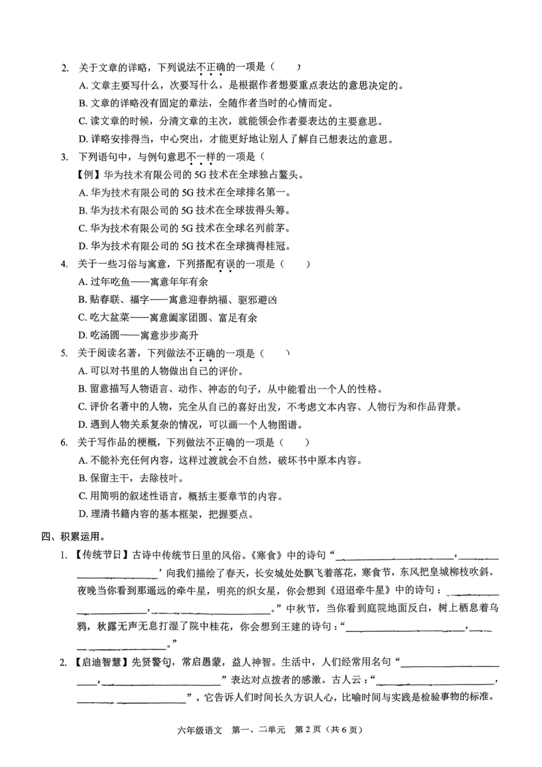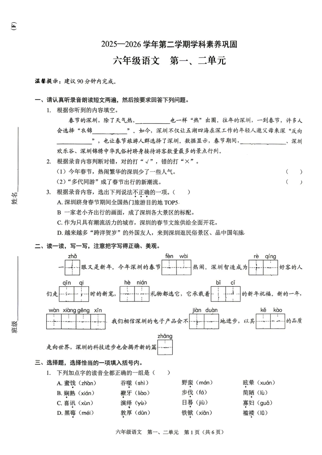 深圳市福田区2025-2026学年六年级下学期学科素养巩固语文 第一、二单元